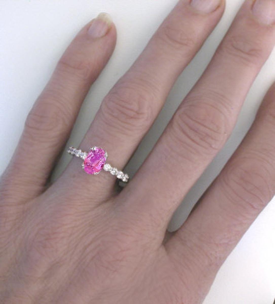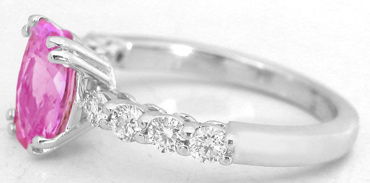 Special Features: Only at MJS! We love the simple elegance of this design. At the center is a beautiful bright pink sapphire in an oval cut. This sapphire has the perfect pink color. Nicely saturated but not too dark. Not pale and washed out either. It is a pretty bubble gum pink and is dressed up nicely by the four diamonds that flank each side. The diamonds are near colorless and better than eye clean. They are also over 5 points each. That is a substantial size for a smaller accent diamond. The diamond presence in this ring is striking and the contrast between the white diamonds and the rich color of the sapphire is quite striking. The basket holding the sapphire is done with four sets of double prongs to ensure that the sapphire is held securely, and the profile of the setting (height off the finger) is low so this is a comfortable wearable design.