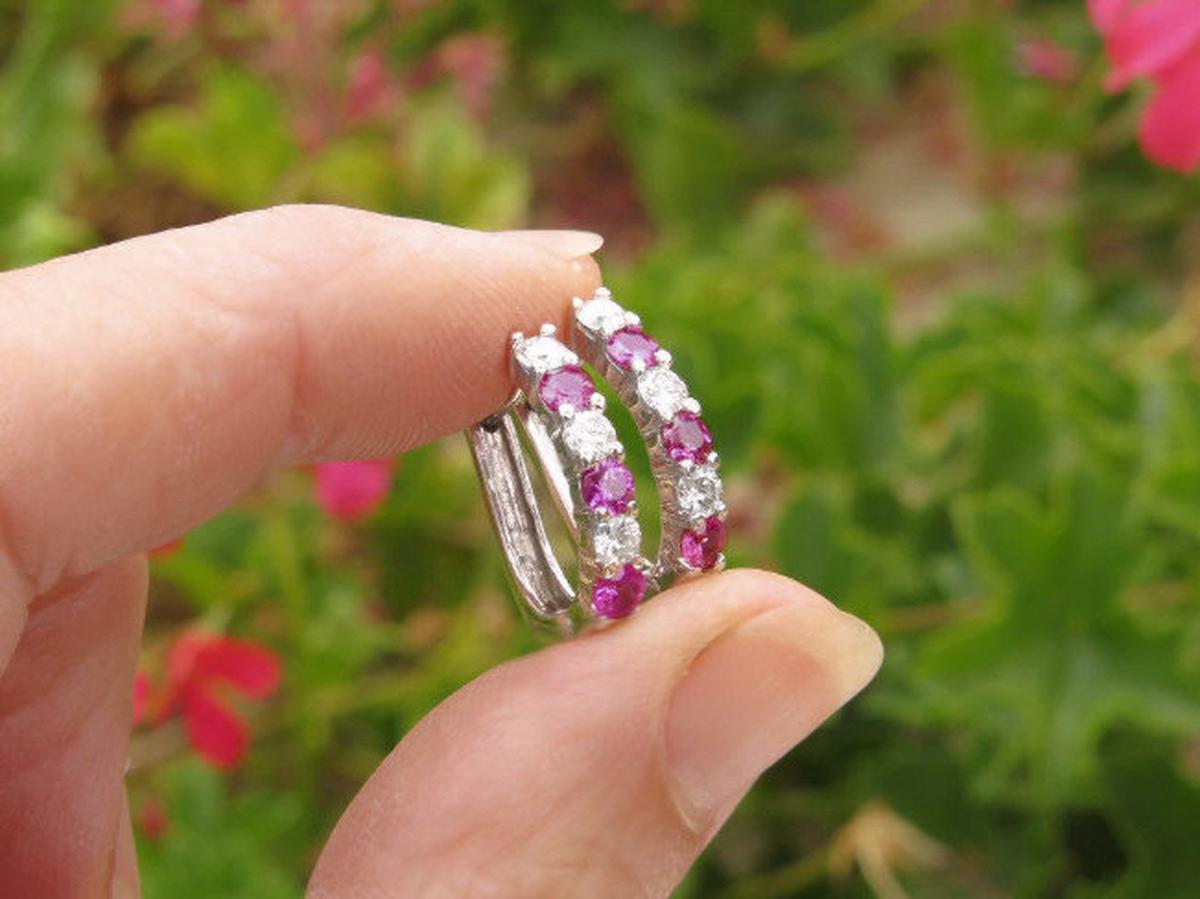 Natural Pink Sapphire and Ideal Cut Diamond Hoop Earrings in 14k white gold   Real Pink Sapphire and Ideal Cut Diamond Hoop Earrings in 14k white gold