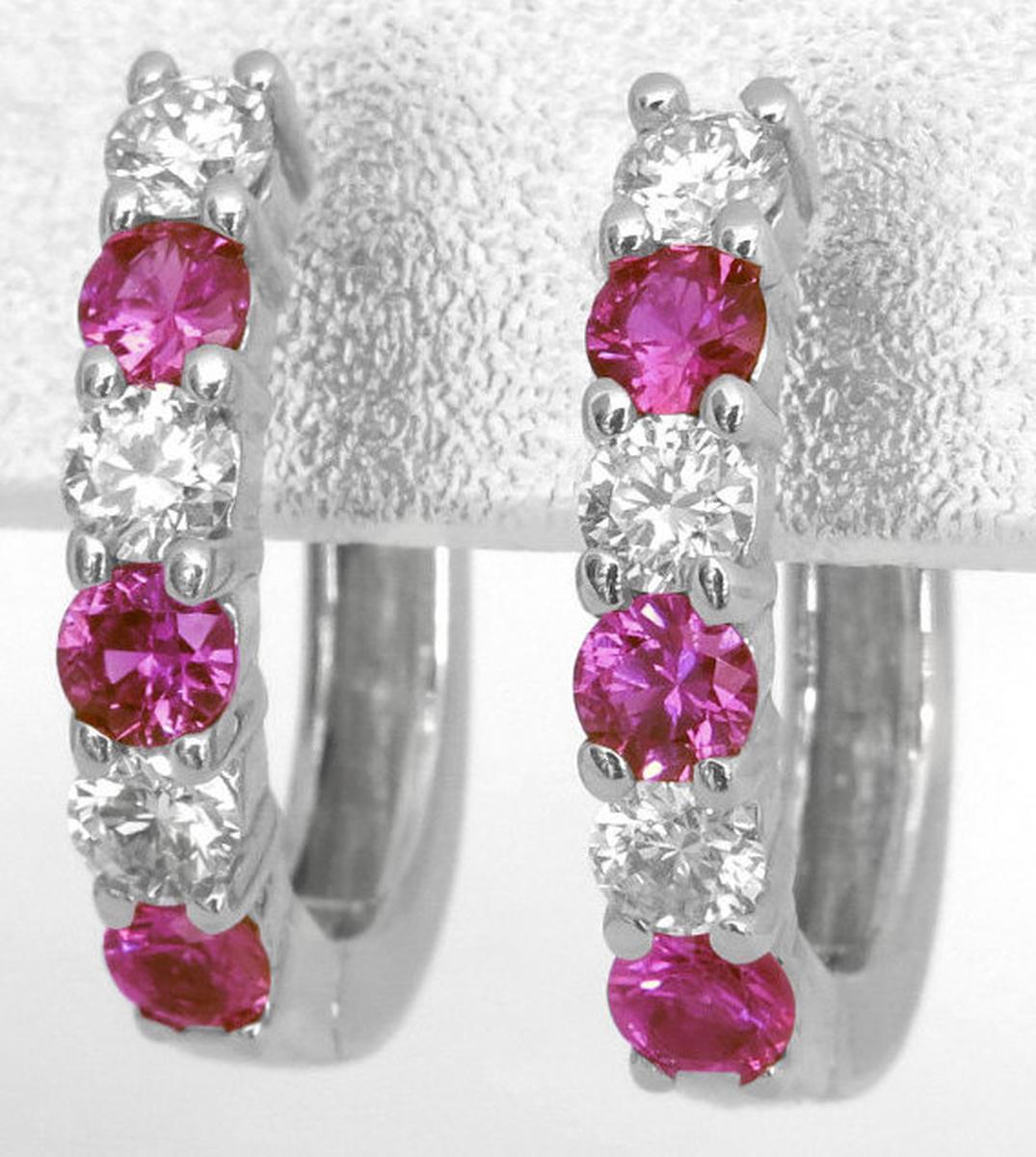 Special Features: These gorgeous pink sapphire and diamond hoop earrings are simply exceptional! Made with extremely fine quality, hot pink sapphires and ideal cut, very fine quality diamonds, these earrings are dazzling on the ear. Setting the stones in an alternating fashion enhances both the diamonds and the sapphires and both stand out beautifully. A perfect size for every day, and they have plenty of presence too.
