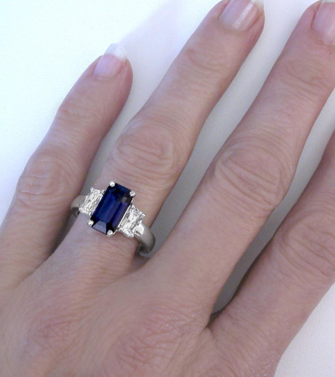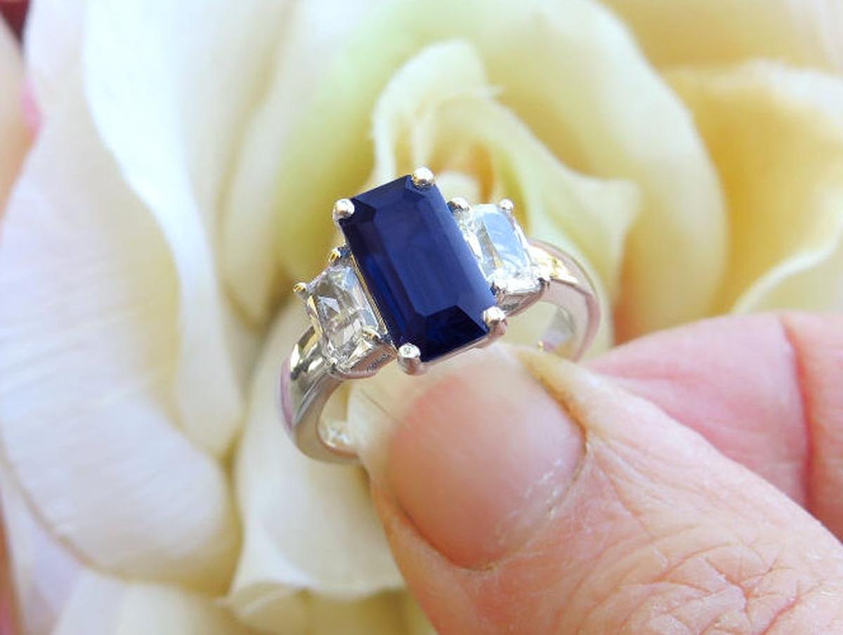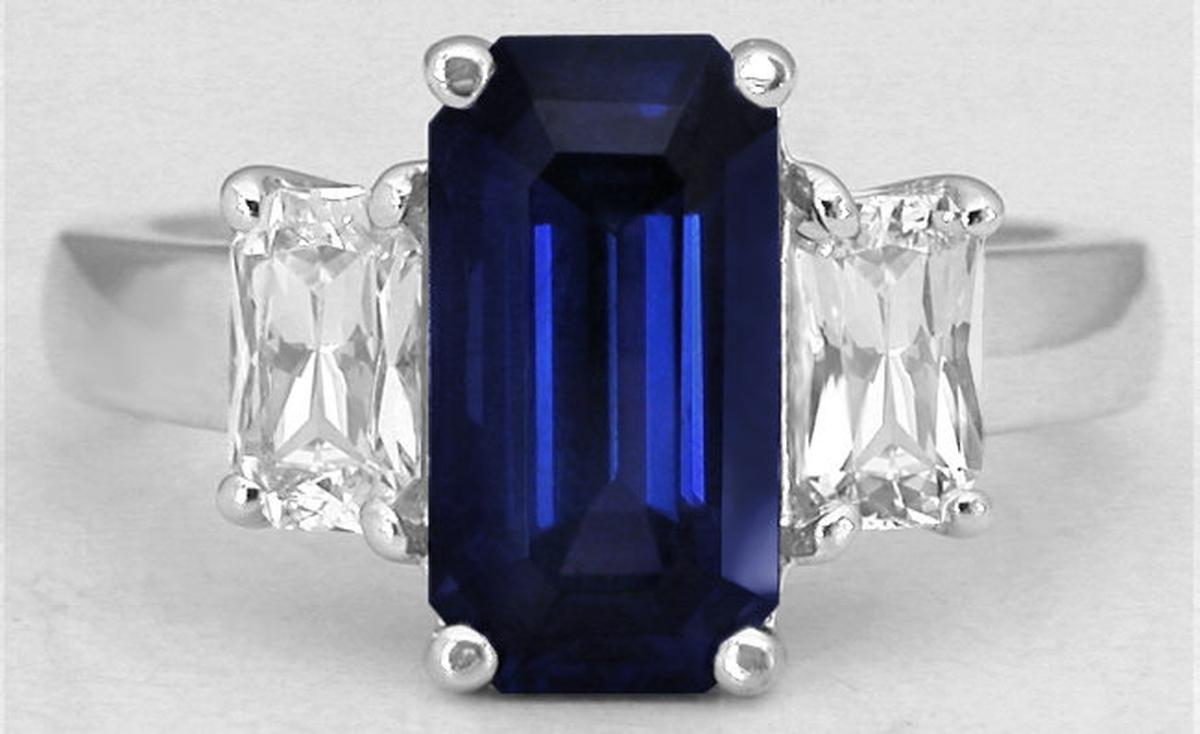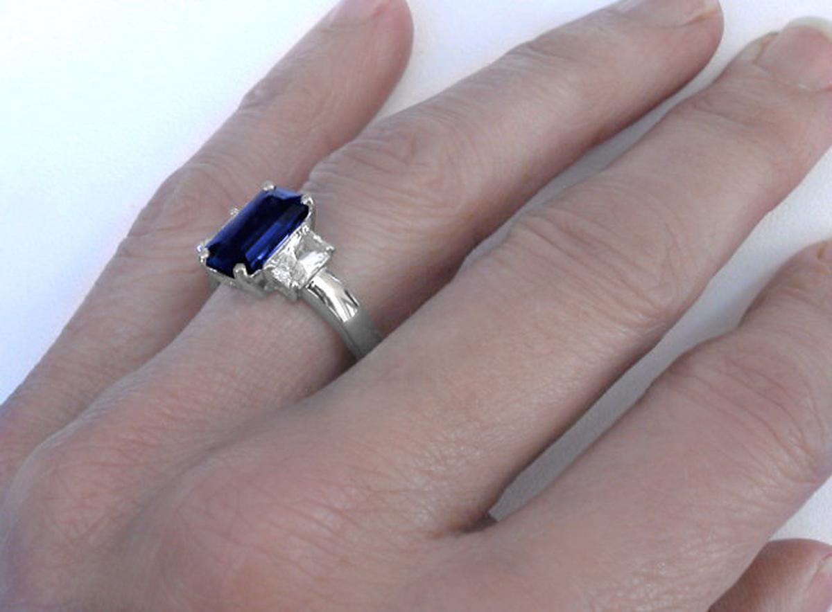 Blue Sapphire: 3.38 carats (6x11.3mm emerald cut)