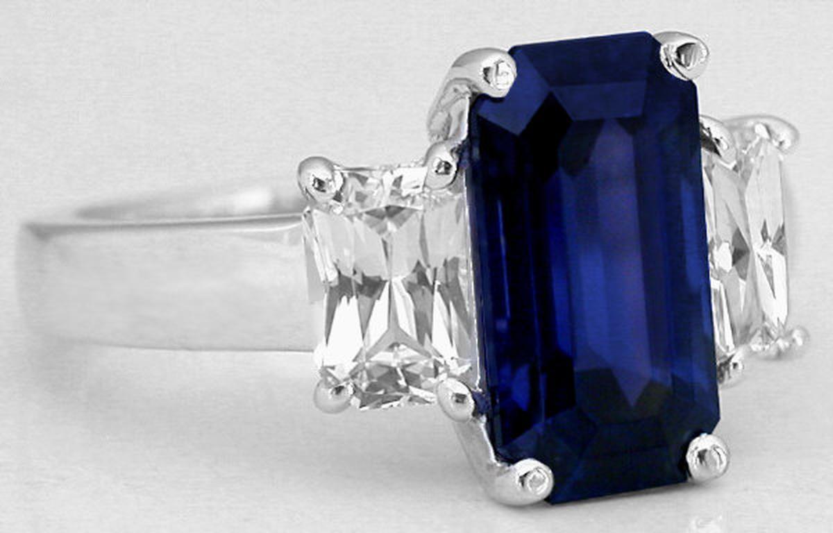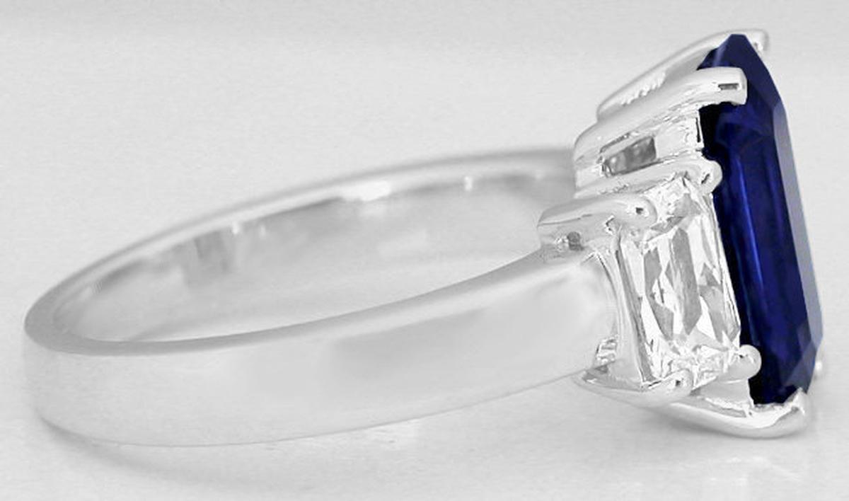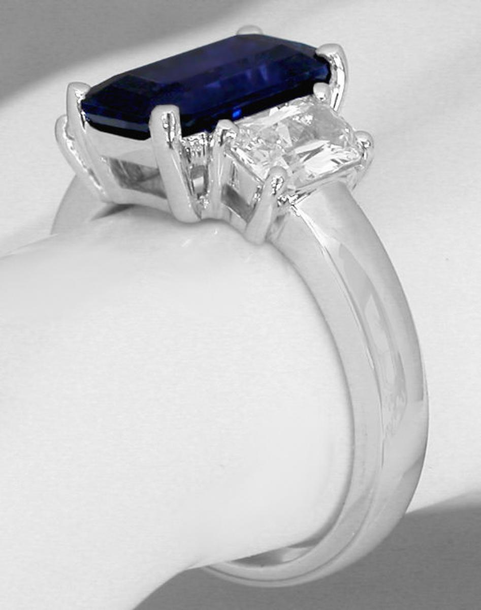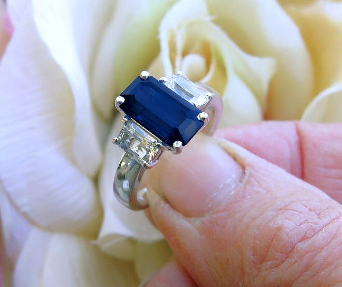 Special Features: This one of a kind sapphire engagement ring showcases a very special natural unheated and untreated blue sapphire flanked by white sapphires. This symbolic past present future design is both elegant and eye catching with the elongated 3.38 carat emerald cut sapphire and its intense and stunning rich royal navy blue hue. This sapphire is extremely rare and truly a one of a kind considering its large size, amazing clarity, fabulous color and the fact that it is completely natural and untreated. The three stone design has a 4x6mm radiant cut white sapphire on either side and these balance the look perfectly. The setting has a low profile and substantial prongs so the ring will be very comfortable and durable for frequent wear. This classic past, present, future design is a perfect choice for an engagement or anniversary ring.