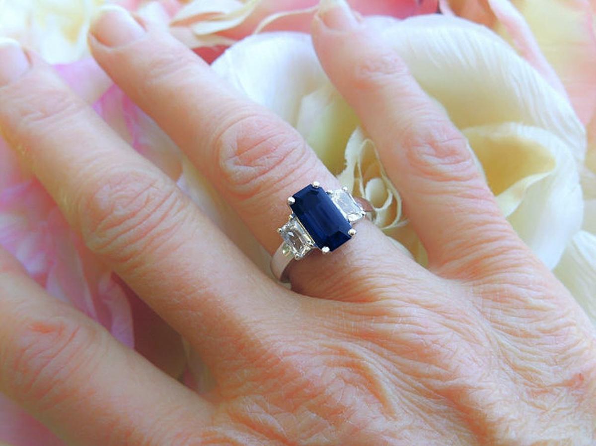Natural Emerald Cut  Unheated Untreated Navy Blue Sapphire and White Sapphire Three Stone Ring in 14k white gold