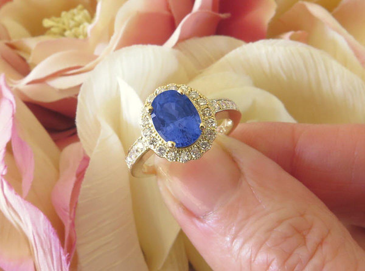 Gemstone: Natural Blue Sapphire - Ceylon- Unheated/Untreated Buy a Natural Untreated Oval Blue Sapphire and Real Diamond Halo Ring in solid 14k yellow gold