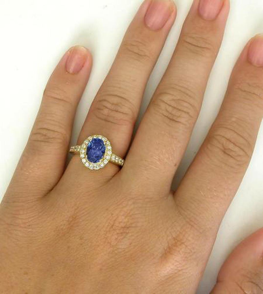 Natural Unheated Oval Blue Sapphire and Real Diamond Halo Ring in solid 14k yellow gold for sale   Unheated Ceylon Sapphire and Diamond Ring in 14k yellow gold
