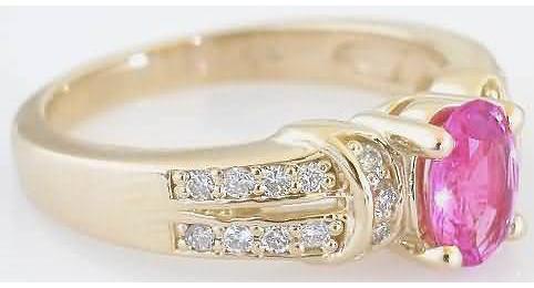 Special Features: Pretty in pink, this beautiful ring features a gorgeous oval pink sapphire set in a simple, yet elegant, 14k yellow gold mounting. The sapphire has a wonderful medium pink bubble gum pink color, not too light, not too intense. A gentle curve of sparkling diamonds accents each side and the split shank is outlined with clean, white bead set diamonds on each side.