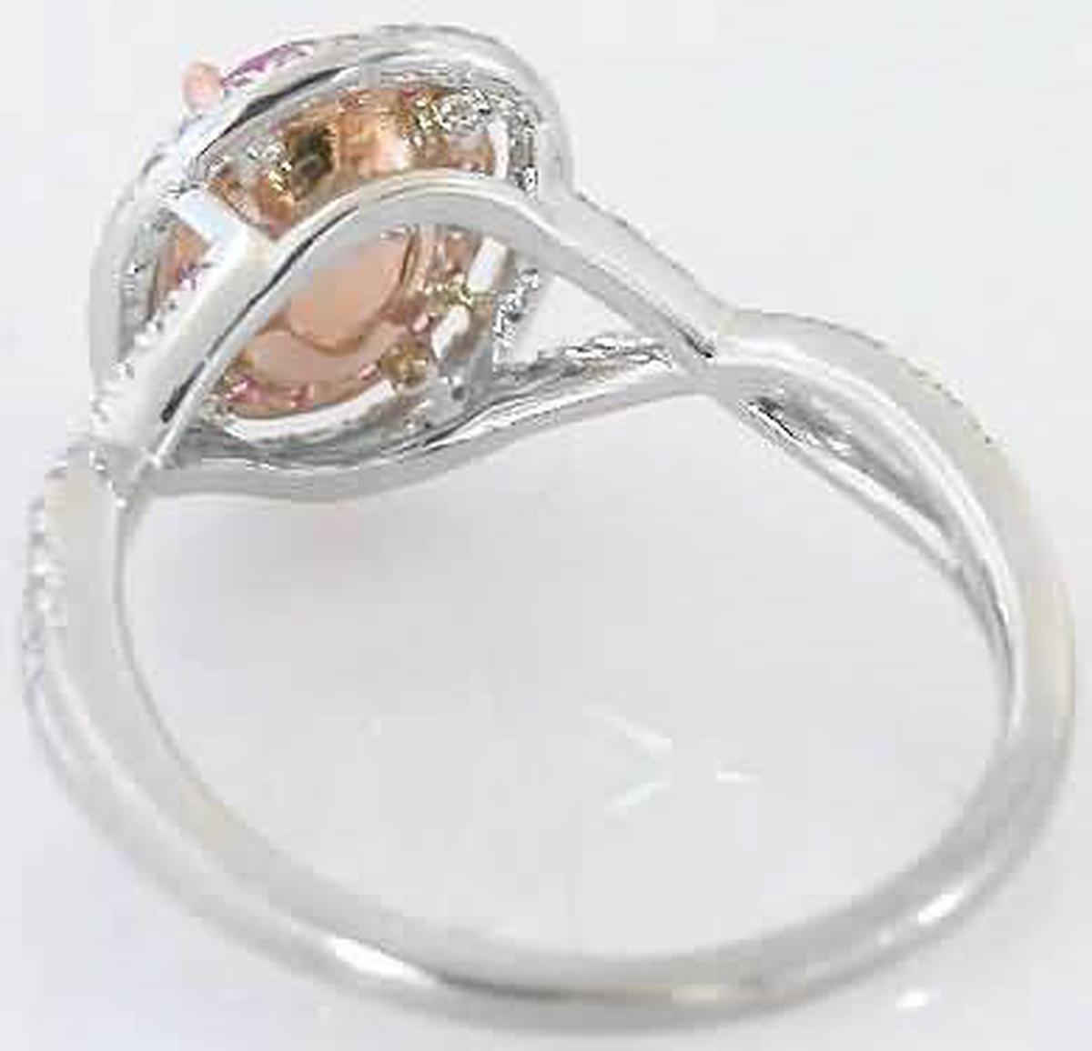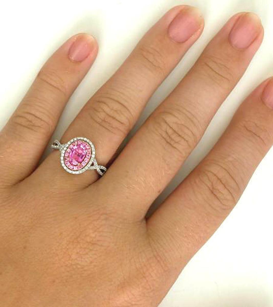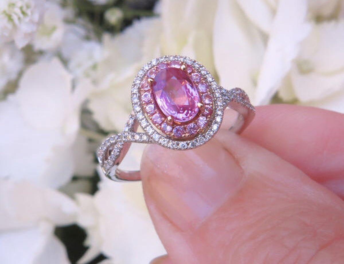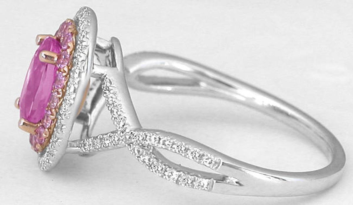 Natural Oval Cut Pink Ring with Pink Sapphire Halo and Real Diamond Halo in a solid 14k White Gold and 14k Rose Gold Split Shank Diamond Band   Natural Pink Engagement Ring with Pink Sapphire Halo and Real Diamond Halo in a solid 14k White Gold and 14k Rose Gold Split Shank Diamond Band for sale