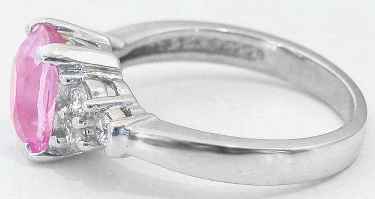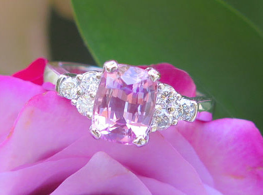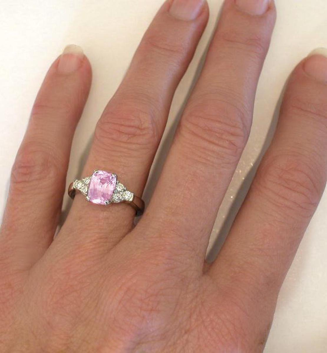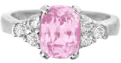 Special Features: For those of you who have fallen in love with the lighter pink that you sometimes see in pink sapphire, then we invite you to fall in love with this stunning ring.  It begins with a beautifully cut, 2.31 carat cushion cut sapphire that has a baby pink color. The sapphire is better than eye clean and is a stunning focal point to this classic design.  The sapphire is accented on each side by three large round diamonds which add a perfect dose of sparkle and shine to this ring. These beautiful stones are set into a pinched shank design band which widens slightly towards the back. Sapphires are the hardest colored gemstone which makes them an excellent choice for any ring that will be worn often.