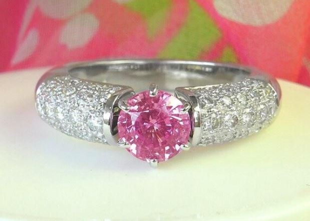 Special Features:Elegance and sophistication, the exceptional engagement ring features a 1.41 carat round pink sapphire with 0.96 carats of round pave diamonds in 18k white gold. Behold the epitome of elegance and beauty, a stunning pink sapphire ring that captures the essence of femininity. This exquisite ring boasts a dazzling round pink sapphire, with a luscious bubble gum pink hue. The vibrant gemstone is the centerpiece of this piece, exuding a sense of sophistication and grace. As if the sapphire alone wasn't enough to captivate your heart, the ring also features 0.96 carats of pave set diamonds. The diamonds are expertly set into a substantial 18k white gold setting that highlights their radiance and complements the pink sapphire to perfection. This elegant pink sapphire ring embodies the spirit of femininity and is sure to make a lasting impression on anyone who lays their eyes upon it. Wearing this ring is like wearing a work of art on your finger, a symbol of love, beauty, and style.