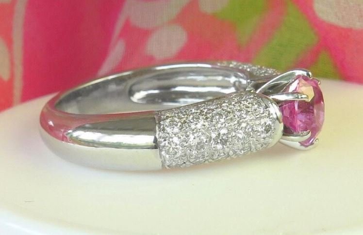 Shimmering pink sapphire ring with pave diamonds in 18k white gold, exuding elegance and femininity.