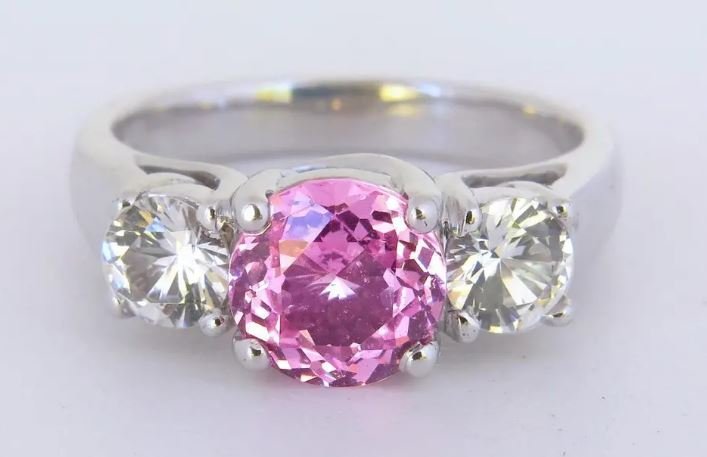 A masterpiece of elegance and vibrant color, this three-stone ring showcases a stunning 1.55ct brilliant-cut pink sapphire at its center, glowing with its playful bubblgum pink hue, while the two 4.5mm white sapphires (0.76ctw) on either side provide a soft, luminous complement to the vibrant center stone. The trellis-style setting in 18K white gold weaves the stones together with graceful curves, symbolizing the intertwined bonds of love, friendship, and commitment. Every detail of this ring is meticulously crafted to perfection, ensuring durability and comfort without compromising on style. The lustrous white gold enhances the sapphires' natural beauty, creating a timeless and refined look. Whether you're marking a special milestone, celebrating your love, or indulging in a unique statement piece, this ring speaks volumes of sophistication and individuality. Imagine this elegant ring on your finger, its beauty catching the light and making every moment feel unforgettable.