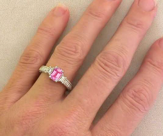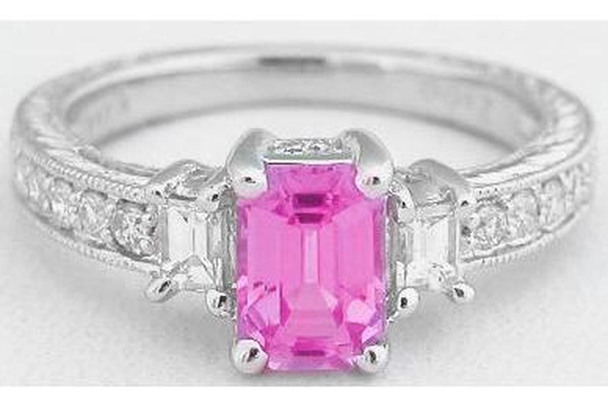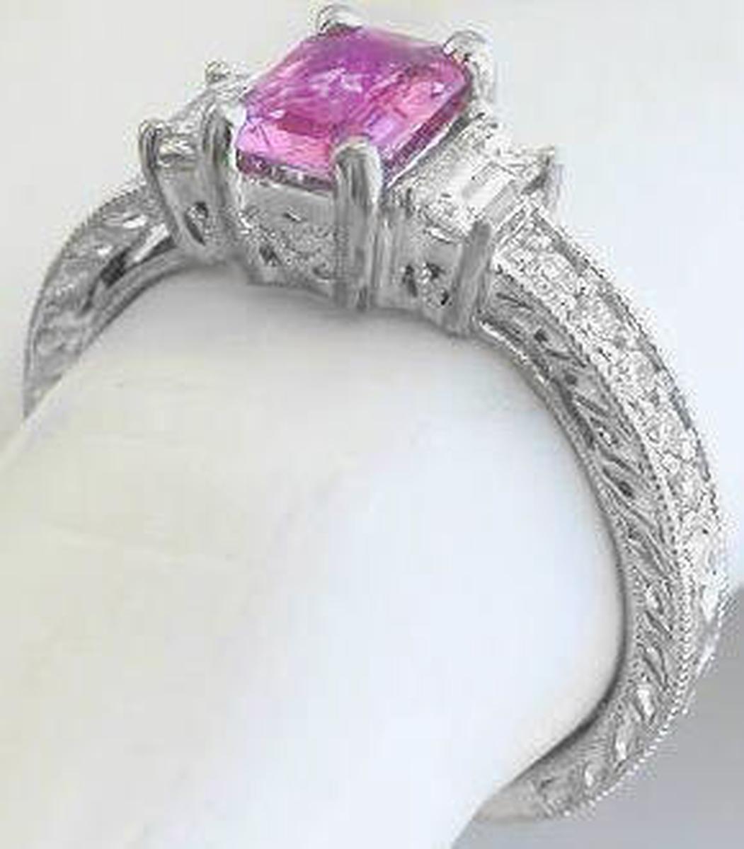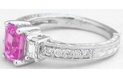 Special Features: This elegant and sophisticated ring has a beautiful eye-clean emerald cut pink sapphire flanked by 2 large baguette diamonds of very high quality. The fancy shank is adorned with tiny pave diamonds surrounded by a milgrain border. A beautiful etched pattern further adorns the sides of the shank.  The size of the center stone is comparable to a 1 carat diamond and the color is gorgeous medium rosy-pink. The color is just perfect. Not too dark, not too light, not too purple. We just love it. The setting is tasteful with the right touch of baguette and round diamonds. The exquisite detail continues with the milgrain edging and engraved band.