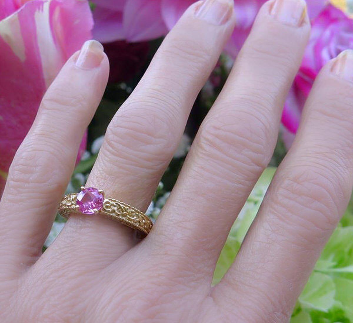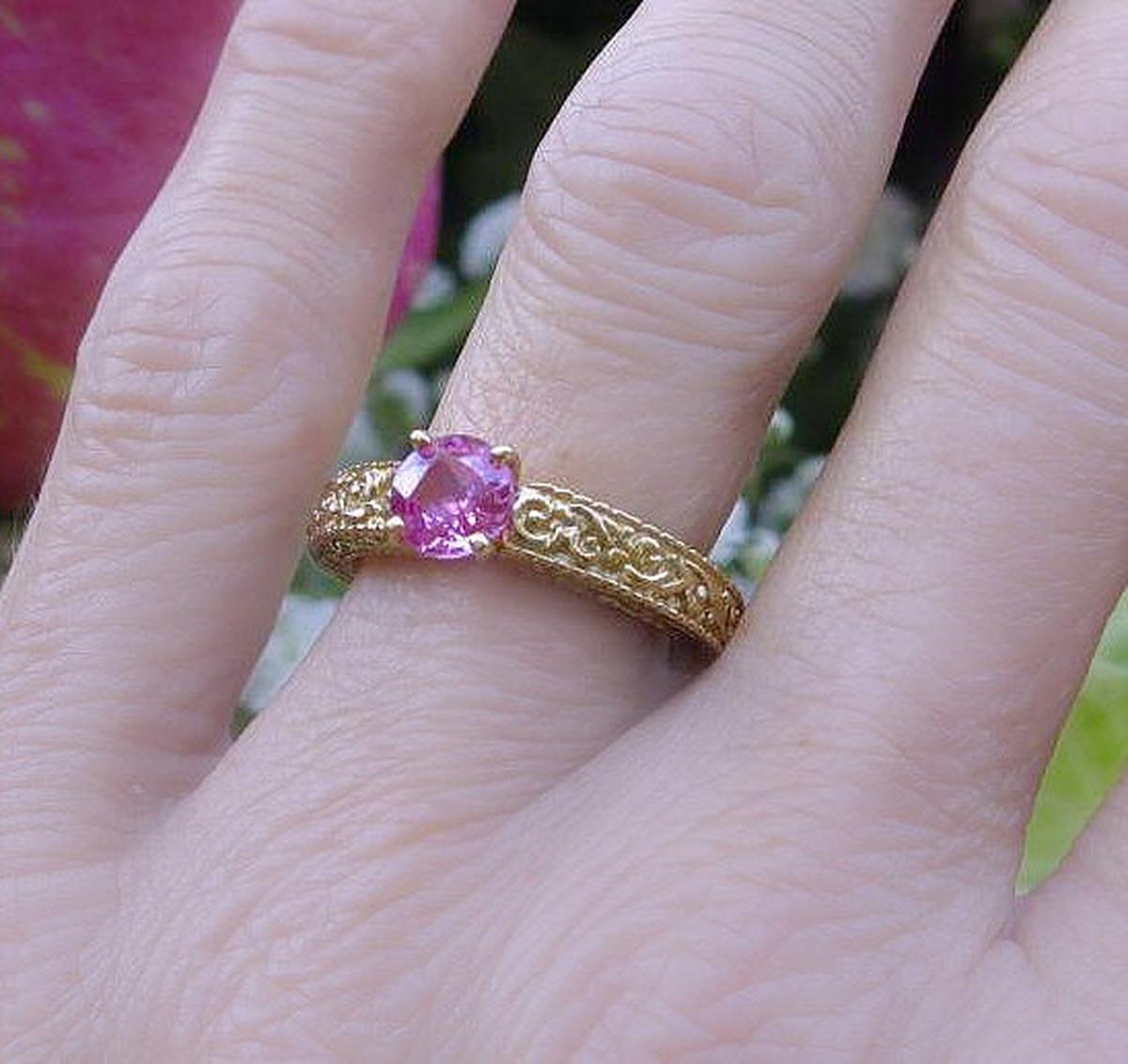 Gemstone: Natural Pink Sapphire Natural Pink Sapphire Ring - Round Cut Sapphire Solitaire Engagement Ring in ornate detailed 14k yellow gold band for sale