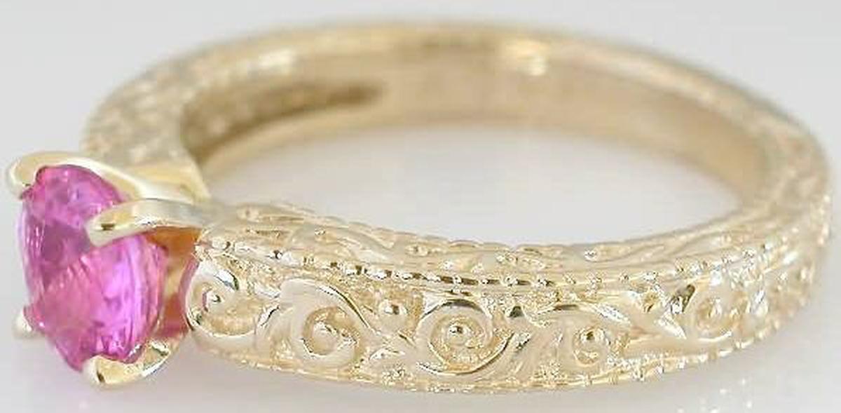 Special Features: If you are looking for an elegant solitaire design with a distinctive splash of femininity, we invite you to consider this wonderful pink sapphire ring. The sapphire weighs just over 1 carat and has a perfect medium bubble gum pink color. It is held in a 4 prong 14k yellow gold setting in an ornately detailed band. A beautiful scroll design has been carved into the ring and the design goes almost all the way around. Even the edges of the ring are finished with a milgrain border. The gram weight of the ring is substantial, at almost 6 grams and it has a nice thickness to it, so you will find it to be very comfortable on your finger.