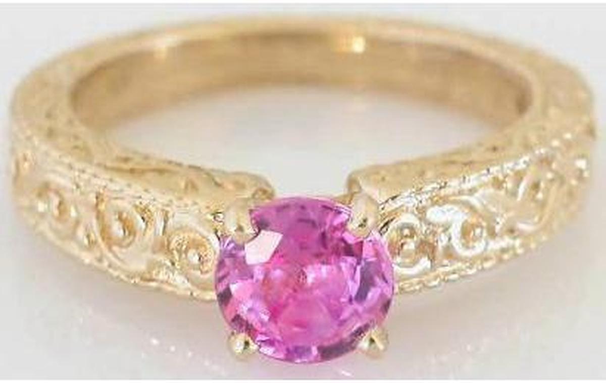 1.04 ct Round Pink Sapphire Solitaire Ring in 14k yellow gold with Carving