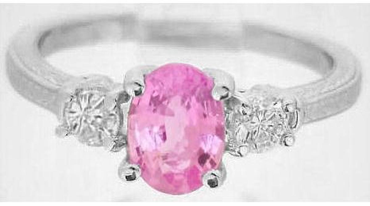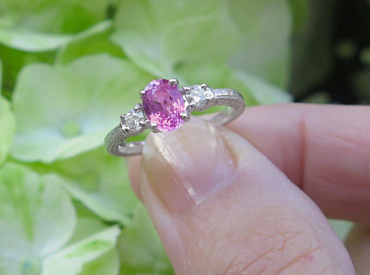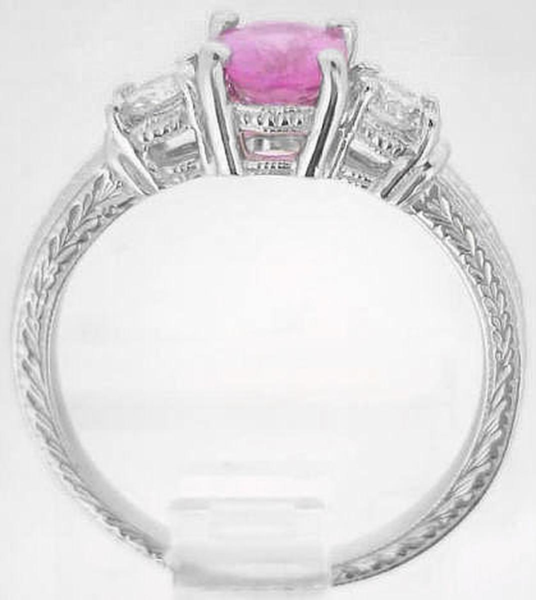 Special Features: A MJS Original Design:  Past-present-future, or three-stone, rings are classics that will always be a wonderful and elegant. But with this original MJS design, we've turned a classic up a notch by engraving the pink sapphire ring on all three sides with beautiful Woodstock's feet and flowers. The pink sapphire at the center measures 7x5mm and is equivalent in size to a 1 carat diamond.  It has a medium pink color and is eye clean. Beautiful fine quality, eye clean, round diamonds accent each side and add a tasteful touch of sparkle to the design.
