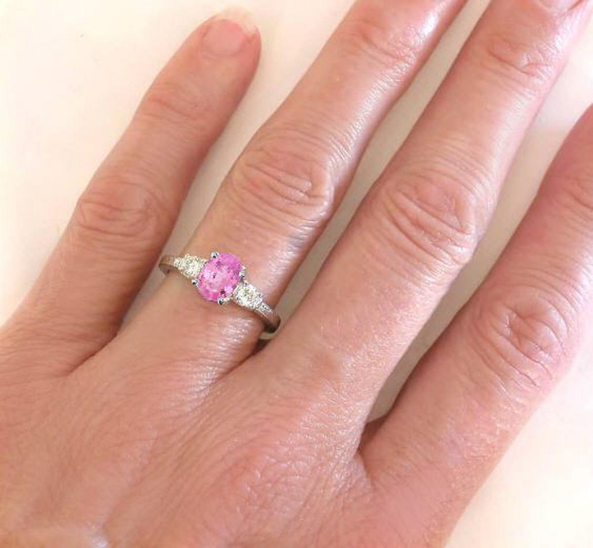 Natural Oval Pink Sapphire Ring with real side Diamonds in 14k white gold for sale   3 Stone Pink Sapphire and Diamond Ring in 14k white gold with Engraving