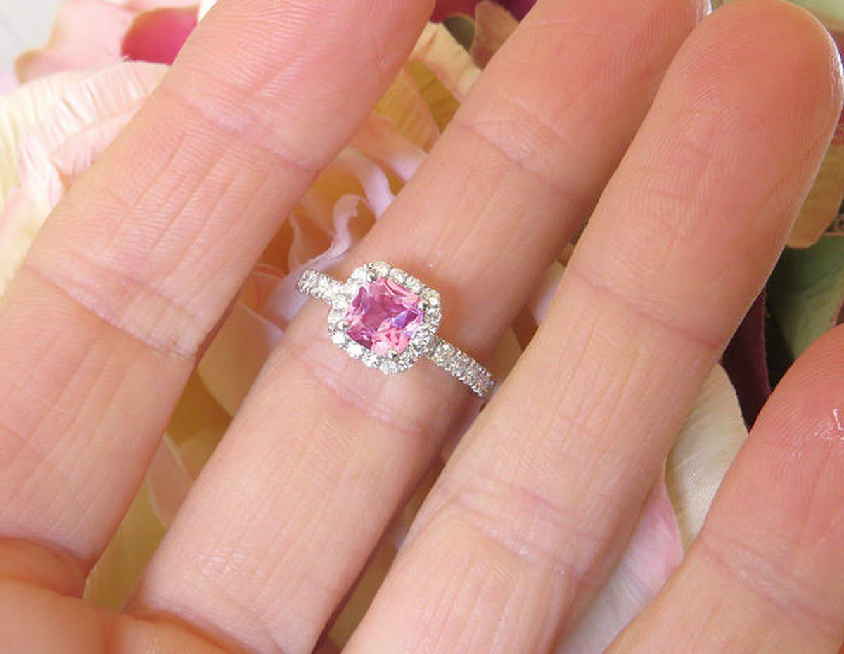 with an inviting, pastel-bubble gum pink color. The sapphire is