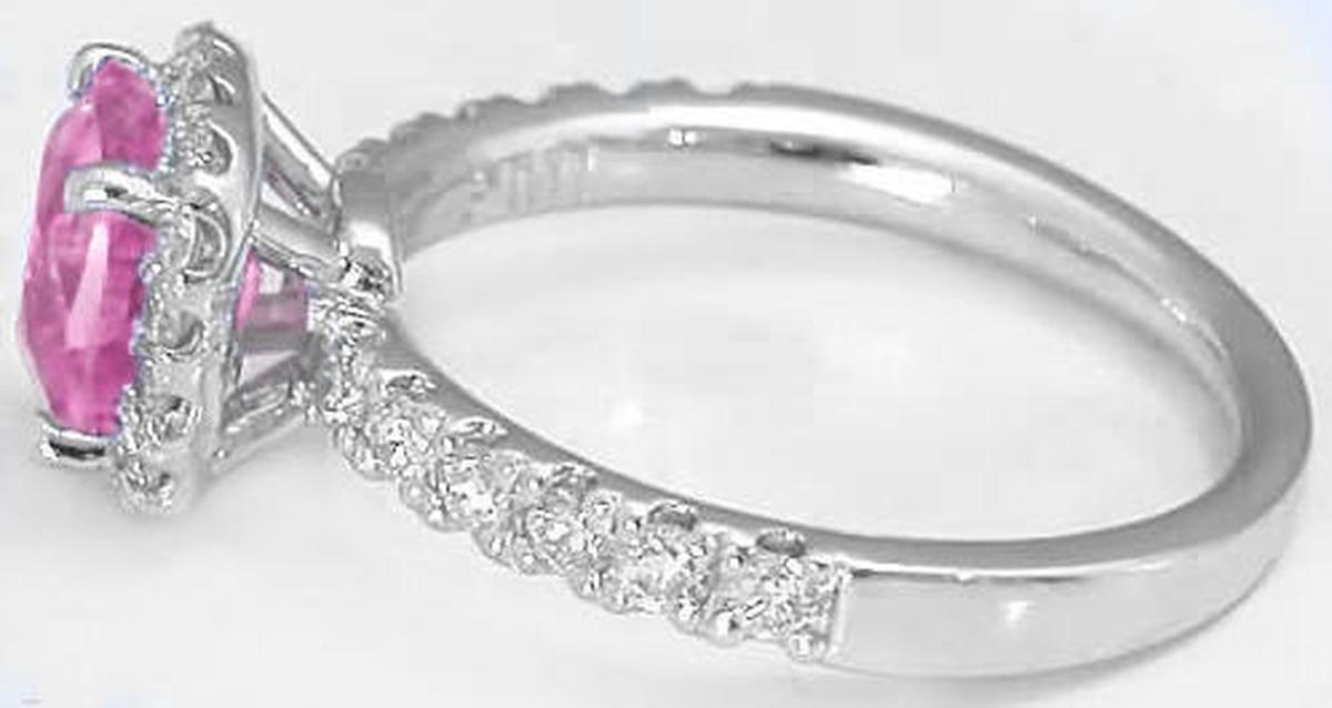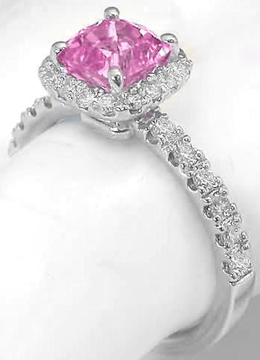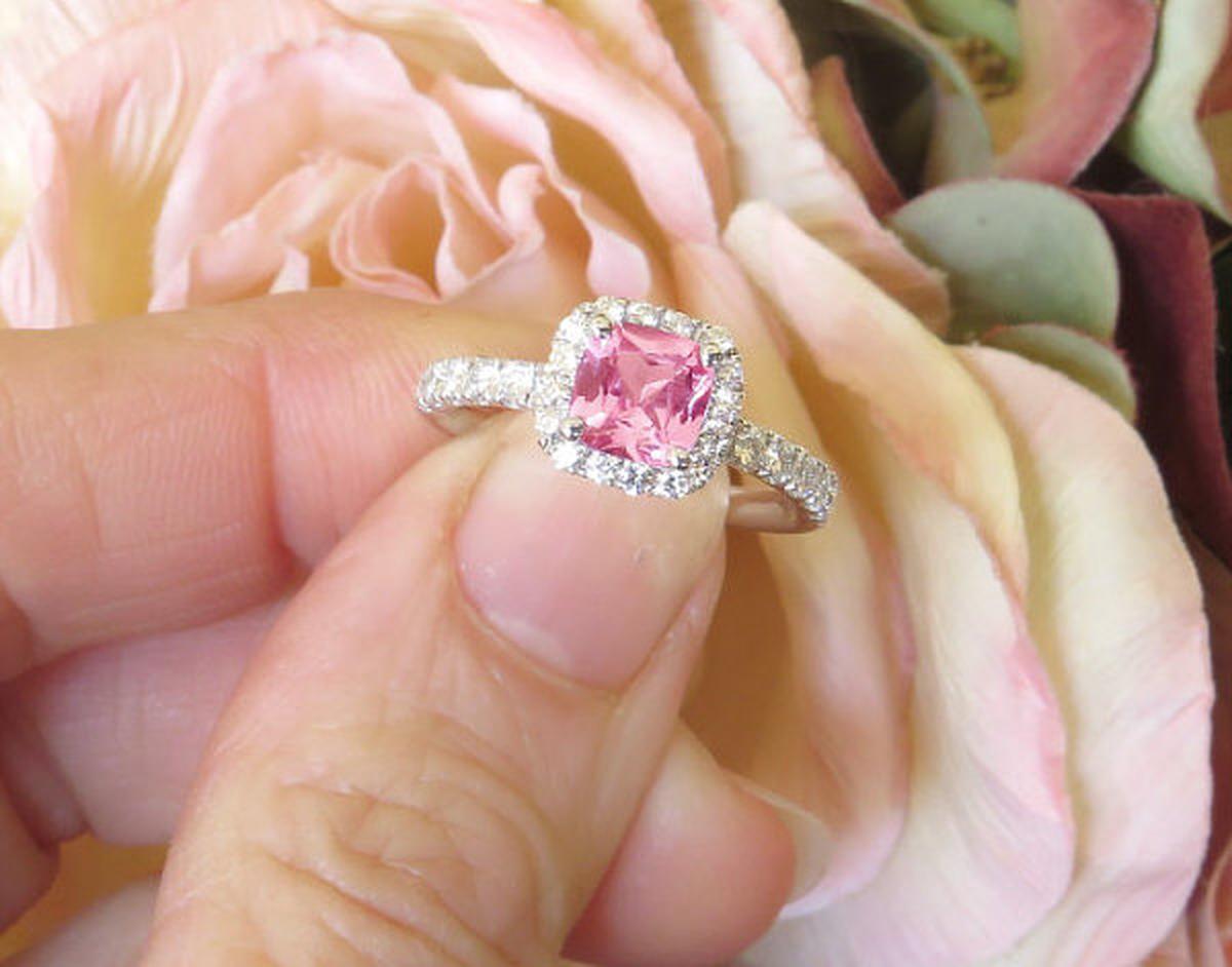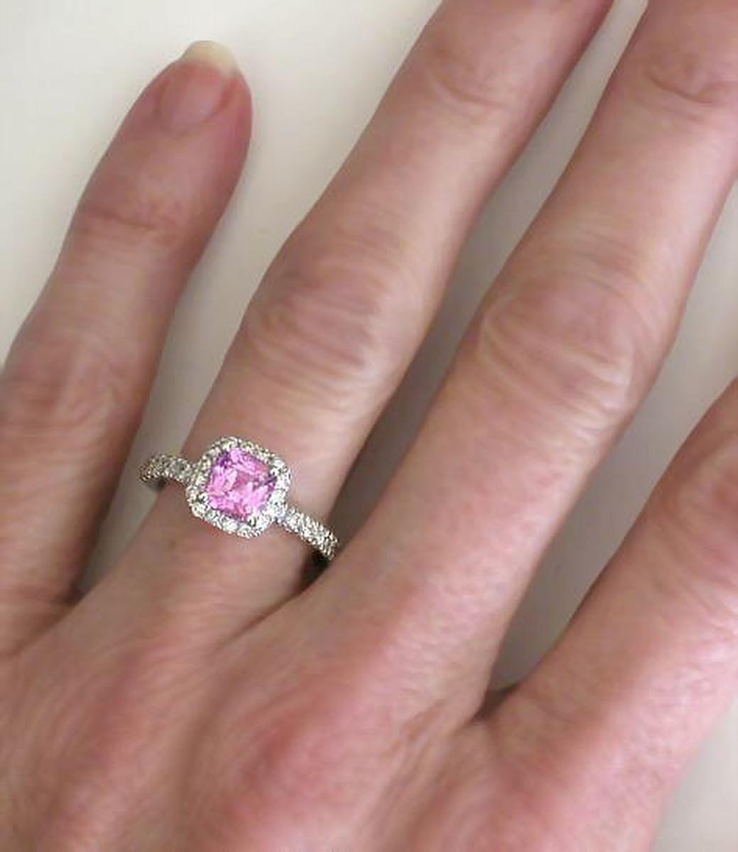 this beautiful ring. At the center is a 6mm cushion cut pink sapphire