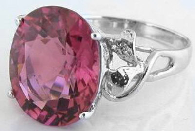 Special Features:Tourmalines are dichroic gems which means that  it is natural to see two colors quite predominantly. This dramatic ring features a large Nigerian pink tourmaline which has shades of pink and berry; The tourmaline gemstone is completely clean, bright and vibrant.  The tourmaline is set into a simple vine and leaf design mounting which showcases the fine gemstone beautifully.