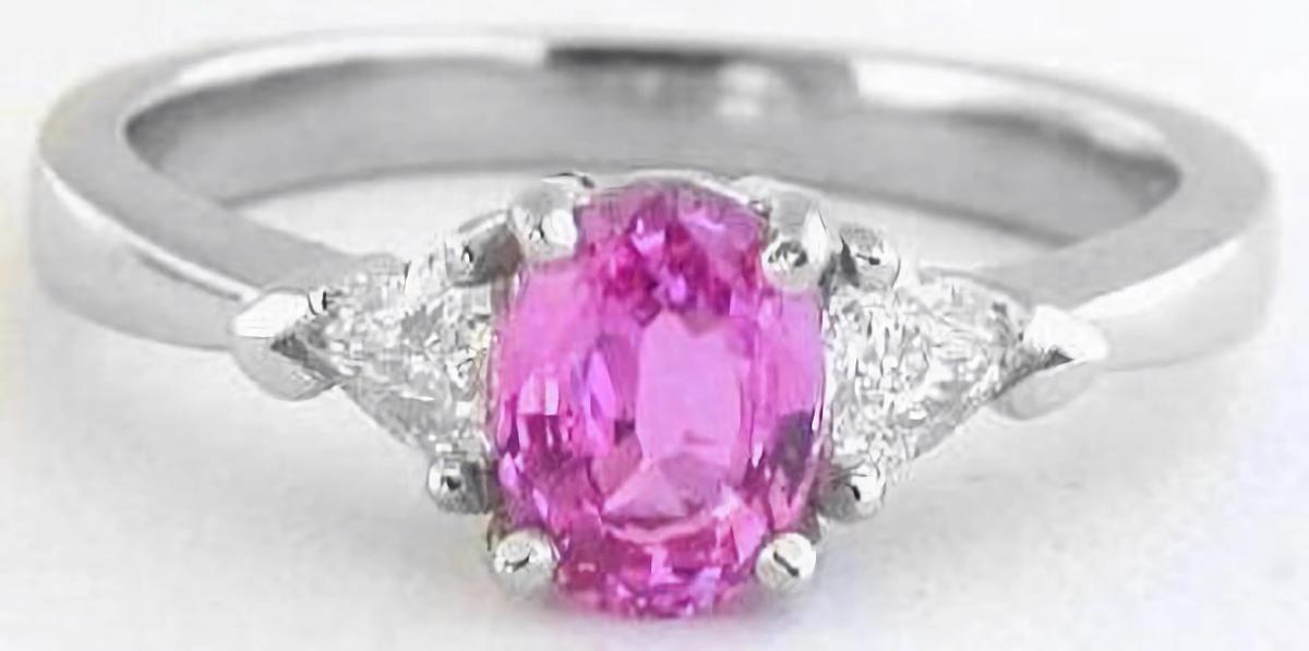 Special Features:What a classic, everlasting design made in one of the world's rarest metals, platinum. The platinum band is a simple prong setting designed to hold the stones securely and be comfortable enough for frequent wear. It wears very well and this gorgeous ring will look as good in twenty years as it does today. The pink sapphire at the center is eye clean and has a bright medium pink color. It  just sparkles beside the 4mm trillion diamonds which are also eye clean. If simple, elegant, classic are words that are used to describe your tastes, we think that you will simply love wearing this beautiful ring.