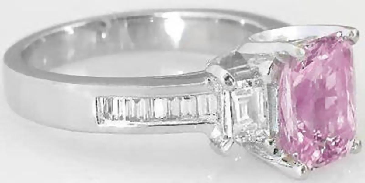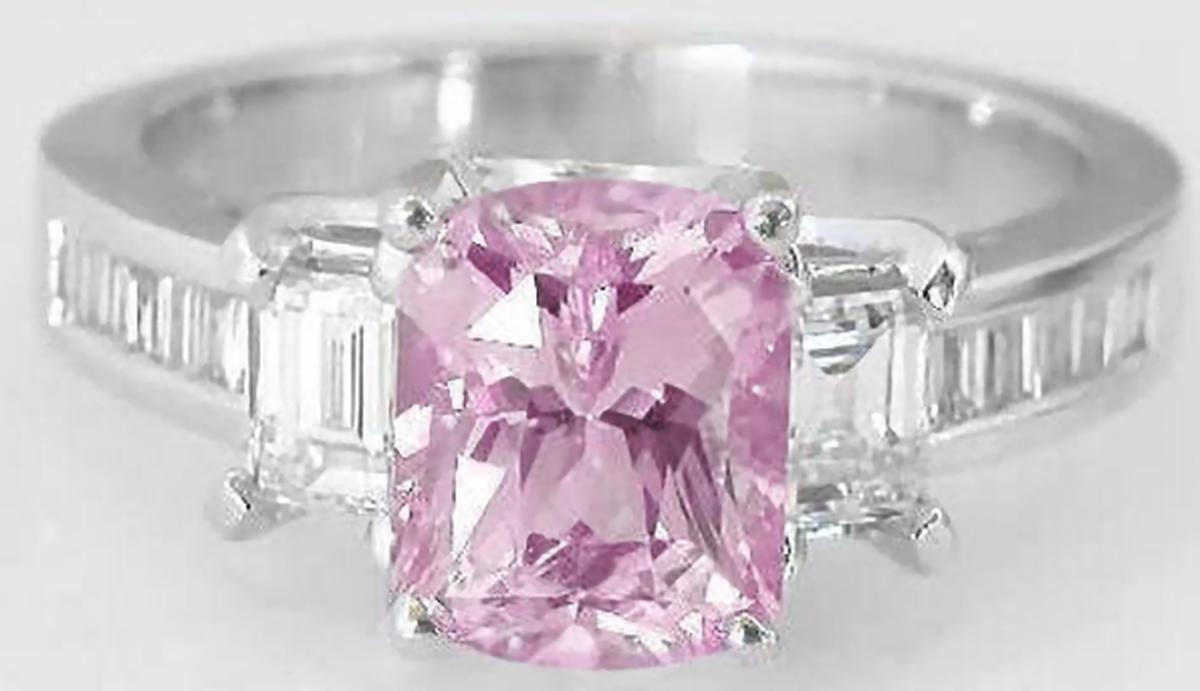 Special Features: This elegant and tasteful design features a lavender pink sapphire with a cushion cut in a substantial platinum mounting with fine baguette diamonds. The sapphire has an exceptional cut with brilliant faceting, something you rarely see in sapphire. It is better than eye clean and essentially loupe clean too. The color is reminiscent of a pink diamond with that amazing lavender pink hue. The sapphire has a slightly darker tone under incandescent lighting and is a delicate pastel pink outside. This important stone is set in a custom platinum mounting with large baguette diamonds of equally exceptional quality.  The mounting is a substantial yet comfortable 6.8 grams of precious platinum, a rare and eternal metal which will safely and securely showcase the fine stones for a lifetime. Platinum is a naturally white metal so the ring will continue to look stunning with minimal care. Can you imagine how she'll feel when you present this exquisite ring to her?  Made of only the finest, most desirable 'ingredients', this ring will make her fall in love all over again.