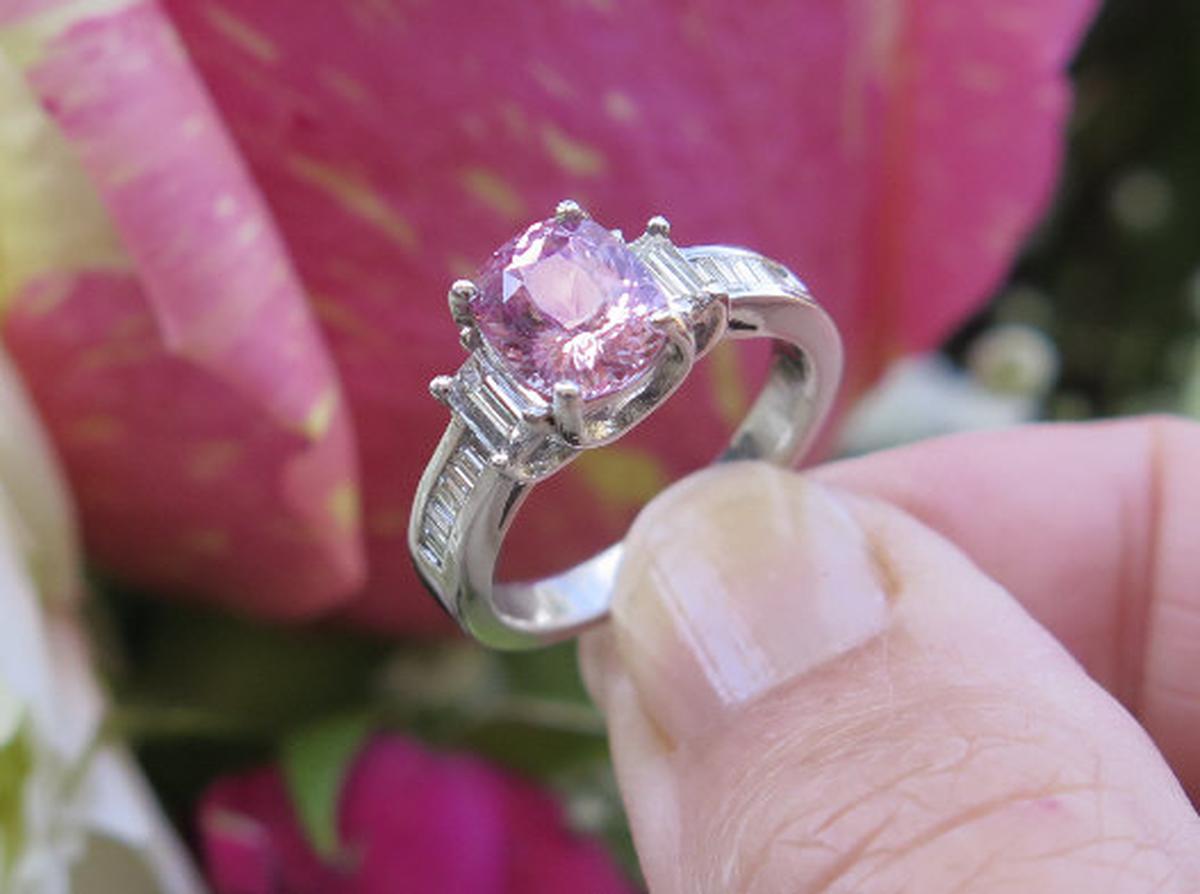 Cushion cut natural pink sapphire ring in platinum   Light Pink Sapphire Baguette Diamond Rings in platinum