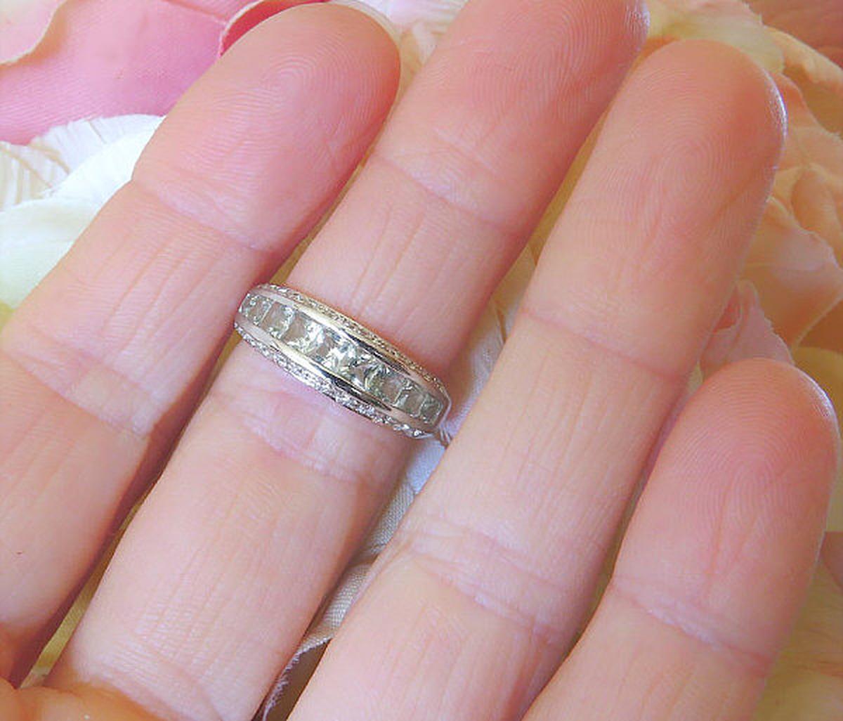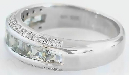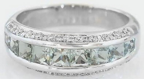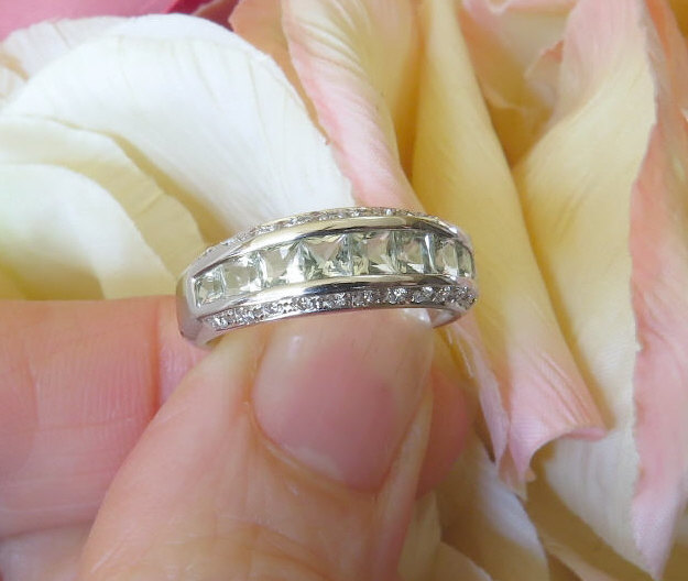 Princess Cut Green Amethyst (Prasiolite) and Diamond Anniversary Band in 14k white gold for sale   Channel Set Princess Cut Green Amethyst (Prasiolite) and Diamond Anniversary Band in 14k white gold for sale