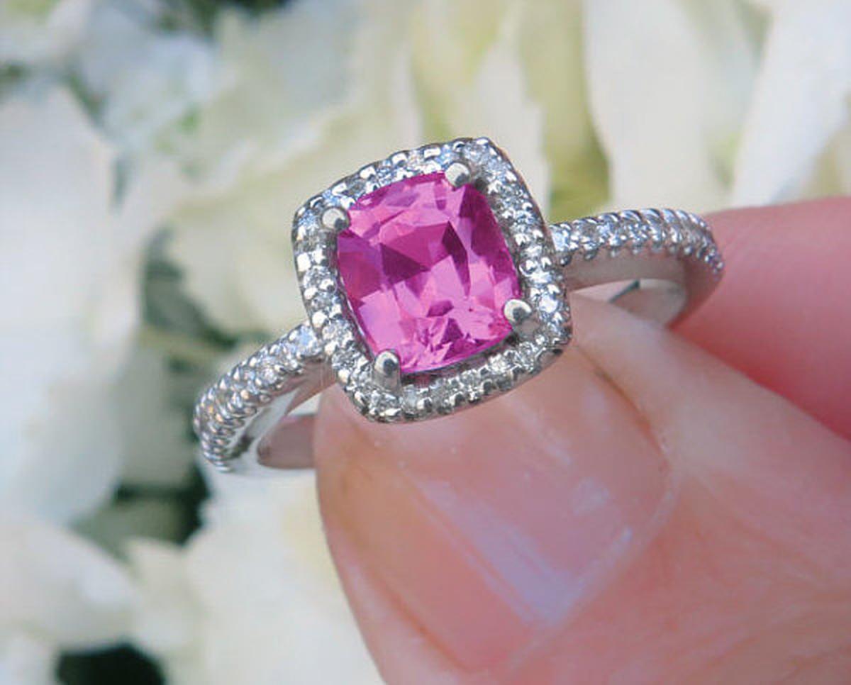 Cushion Cut Hot Pink Natural Sapphire Engagement Ring with Real Diamond Halo in 14k white gold   Hot Pink Sapphire Diamond Wedding Ring in 14k white gold