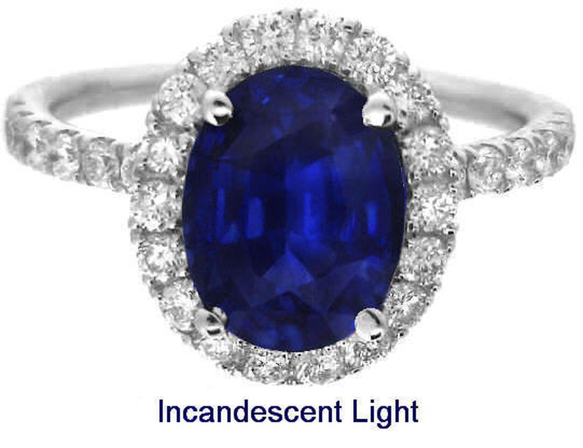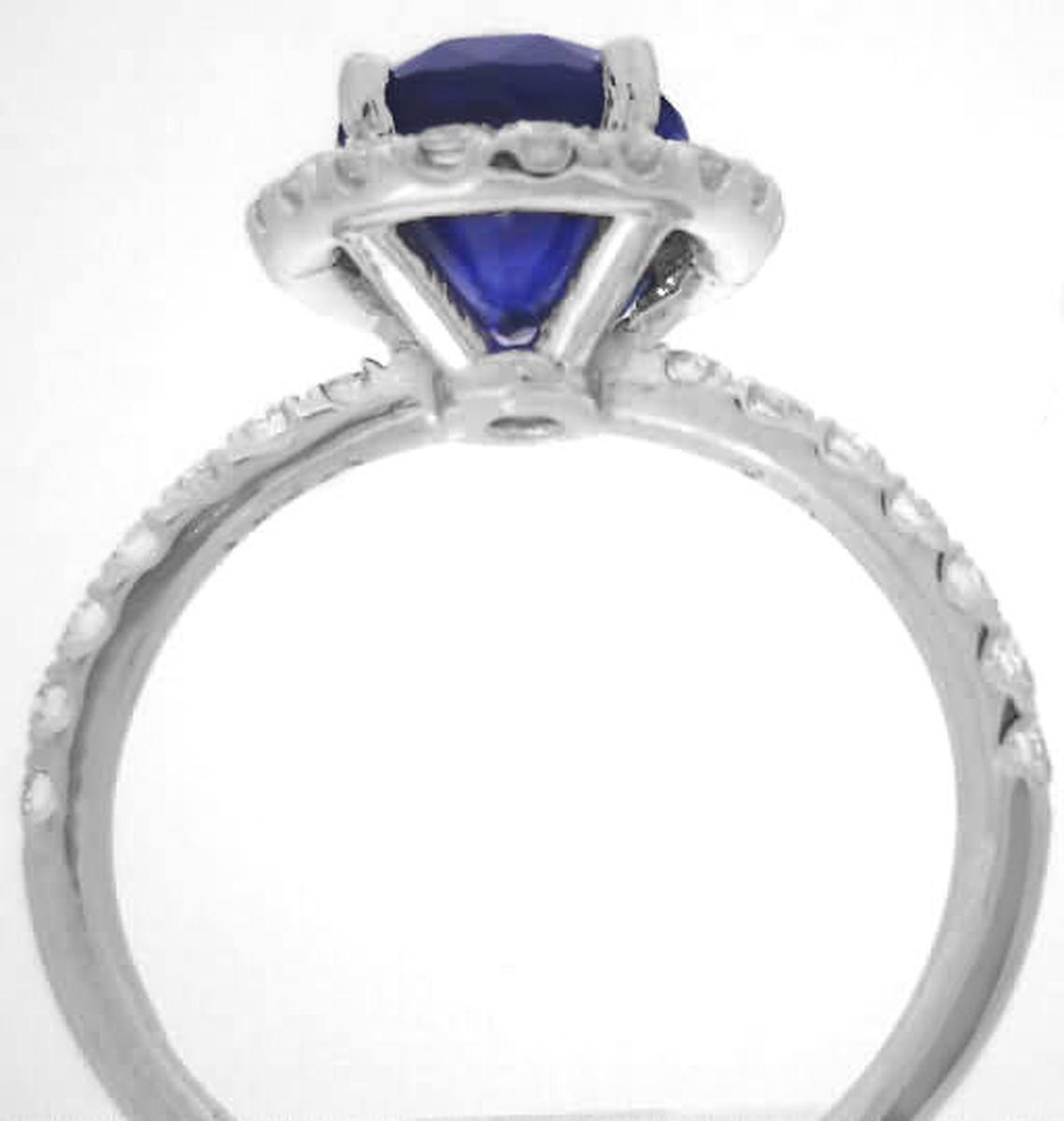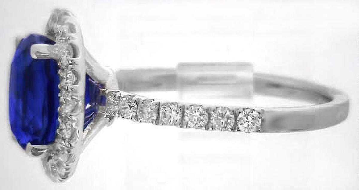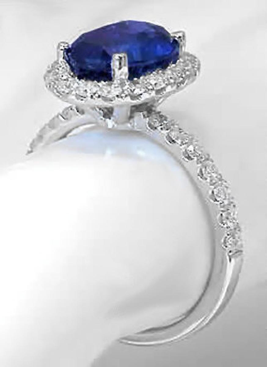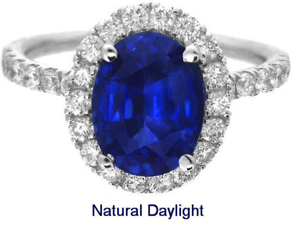 Special Features: Elegant simplicity, this gorgeous diamond halo settings features the finest sapphire that we offer . Without a doubt, this is a very rare sapphire due to its size, clarity and breathtaking color. The sapphire weighs 3.64 carats and is VVS1 in clarity (meaning that it is better than eye clean).  We have included two main pictures of the ring showing the sapphire in both incandescent (indoor) lighting and natural light (daylight). The sapphire is a dark royal blue in indoor light with a subtle glow of the intense royal cornflower blue color. With natural light on the stone, it glows even more and when you take it outside, it is simply mesmerizing; the sapphire is a vivid and intense royal cornflower blue, a color possessed by the world's finest sapphires The setting we have selected features a gorgeous diamond halo and small round diamonds in a skinny band.  The diamonds are near colorless and eye clean and turn the sparkle factor up a notch for sure! The sapphire is dazzling and eye-catching on its own and the diamonds bring out its beauty even further. There are 18 diamonds set around the sapphire and 7 on each side on the band, for a total of 32 diamonds. The basket setting for the sapphire is open to allow the light to play off the facets of the sapphire. This exceptional ring is a one of a kind and cannot be duplicated. Sapphires of this quality are exceptionally rare and you will be proud and simply feel like a queen to wear such a truly special and amazing piece.