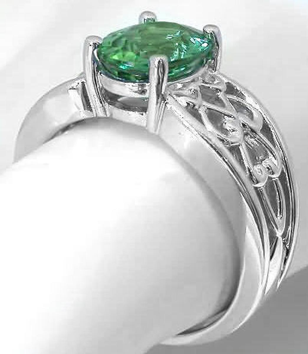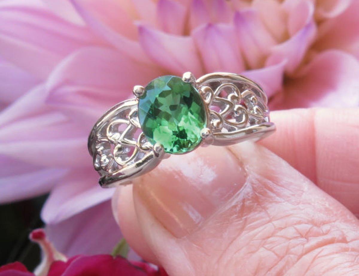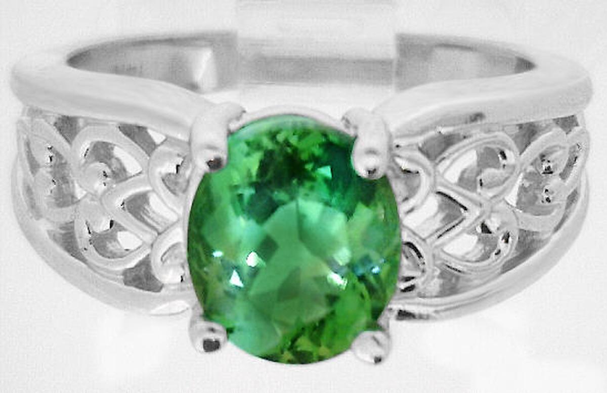Special Features: This ring was designed for those of you who enjoy ornate designs and prefer a piece without diamonds. The color of the seafoam tourmaline is wonderful. It's a combination of  apple, light olive and forest green. and even flashes of turquoise.  The tourmaline has a unique color, unlike peridot and traditional green tourmaline, and it is very hard to find. The tourmaline is also eye clean. You will simply fall in love with this fine stone. The 14k white gold setting has a beautiful open scroll pattern which adds a lot of design interest to the piece and also importantly, the ring is smooth and comfortable between the fingers.