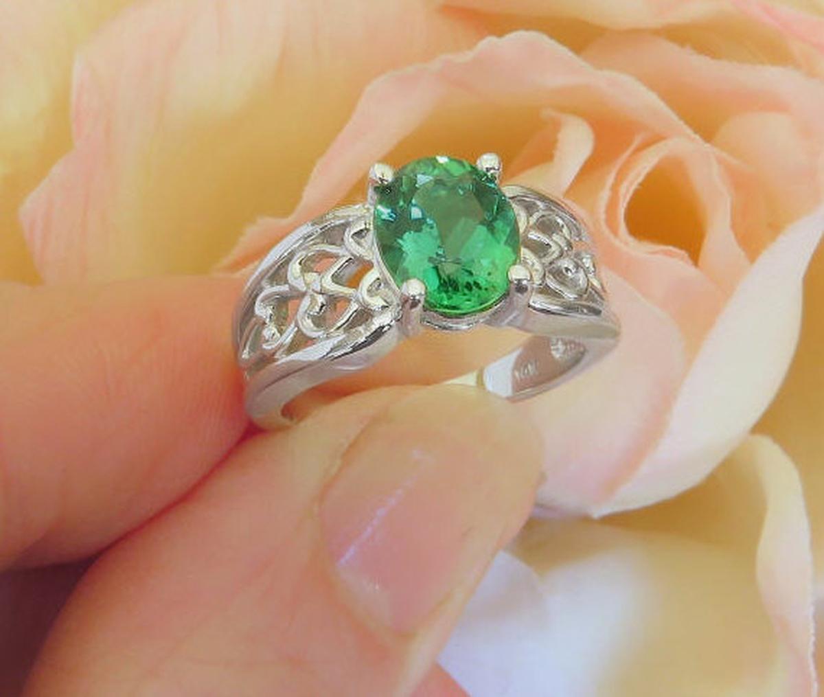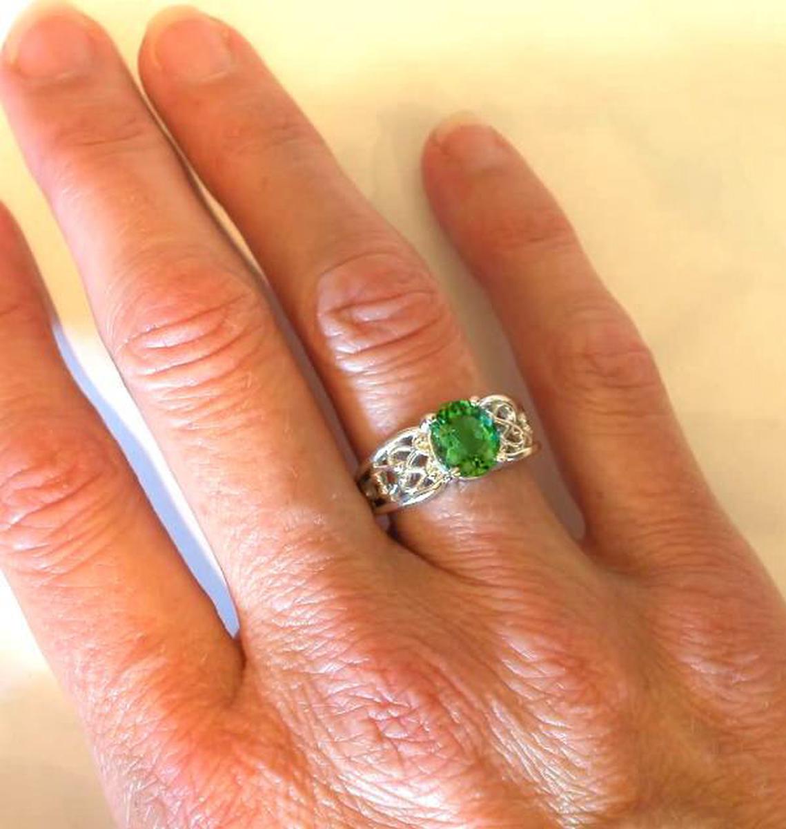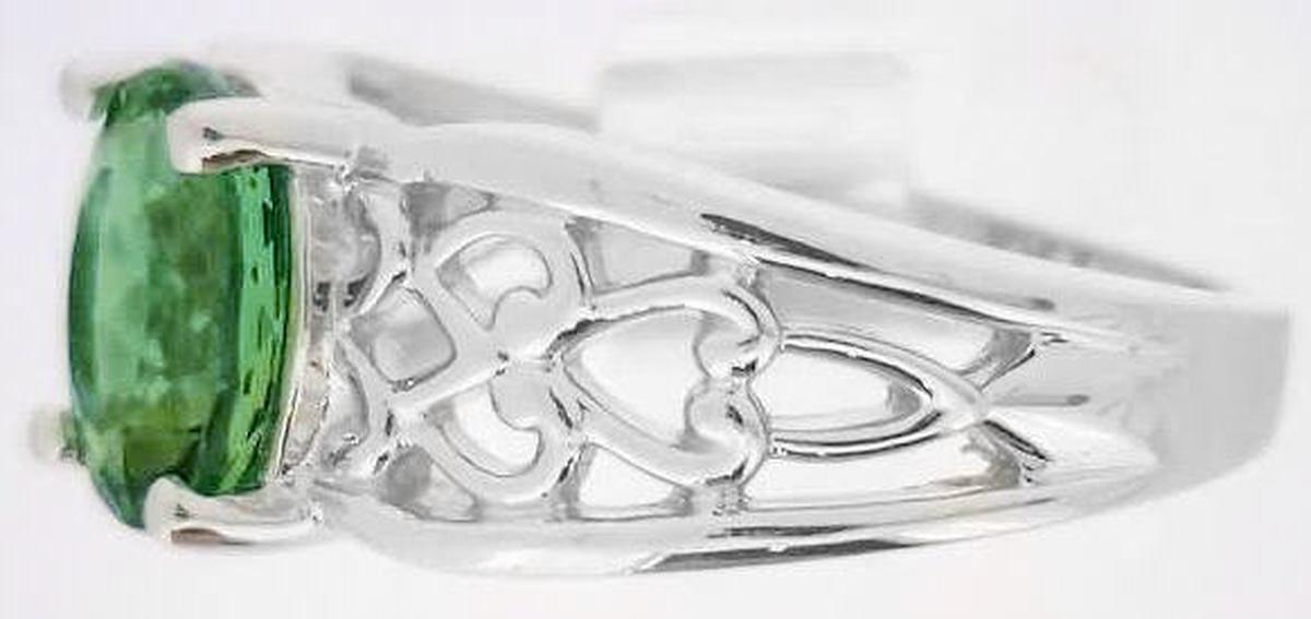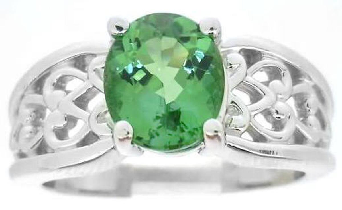 Special Features: This ring was designed for those of you who enjoy ornate designs and prefer a piece without diamonds. The color of the seafoam tourmaline is wonderful. It's a combination of  apple, light olive and forest green. and even flashes of turquoise.  The tourmaline has a unique color, unlike peridot and traditional green tourmaline, and it is very hard to find. The tourmaline is also eye clean. You will simply fall in love with this fine stone. The 14k white gold setting has a beautiful open scroll pattern which adds a lot of design interest to the piece and also importantly, the ring is smooth and comfortable between the fingers.