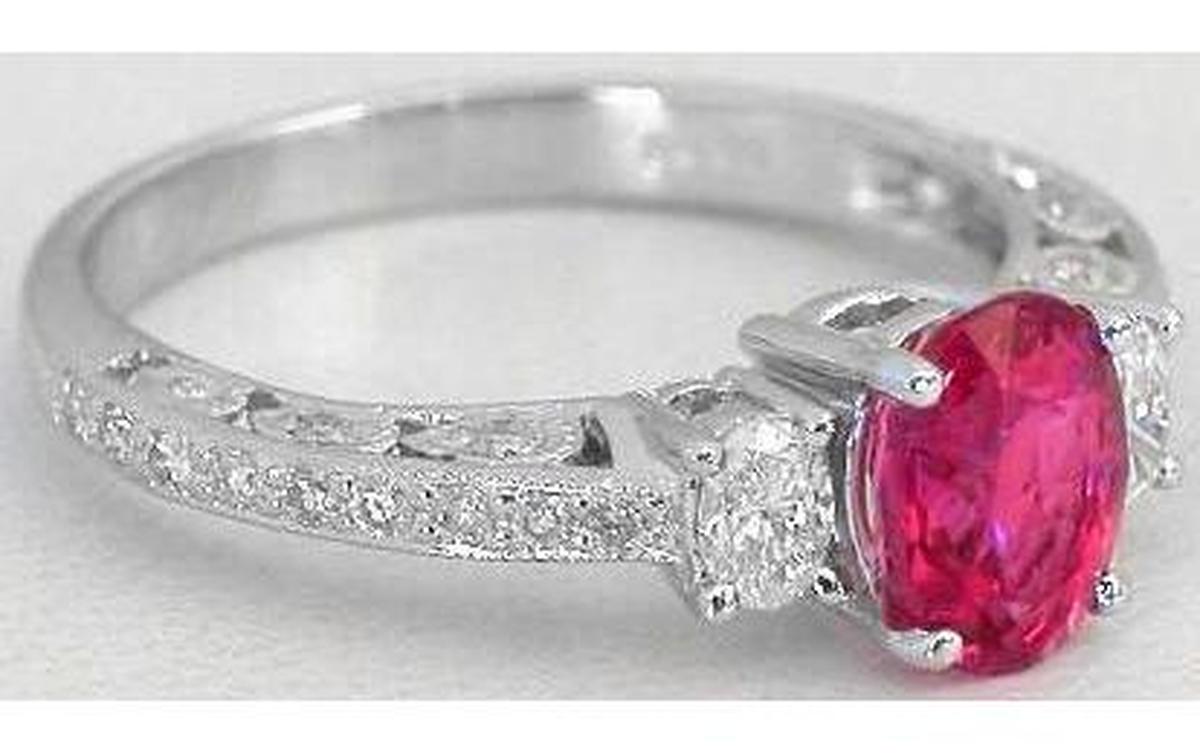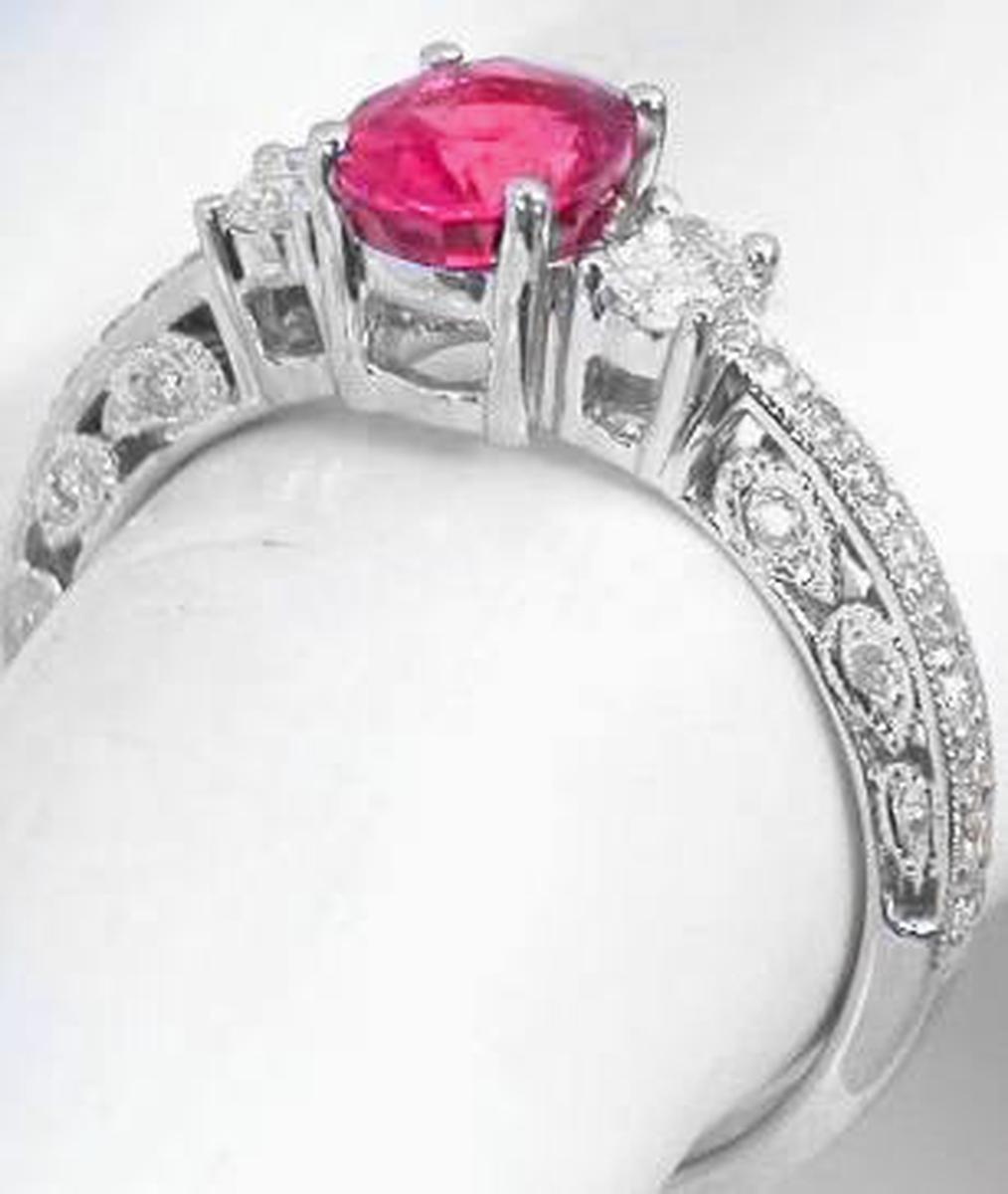 Special Features:For those of you who love antique styled jewelry, this elegant ring is a perfect choice. The gorgeous color of the hot pinkish red rubellite tourmaline just dazzles next to the large oval diamonds which are set on either side.  The rubellite is eye clean and is an absolutely stunning focal point to this gorgeous ring. Beautiful antique styling, milgrain edging and bead set diamonds finish the look. This ring would make a perfect engagement ring since we also have a matching band available.  The matching band incorporates the same design elements with bead set diamonds, milgrain edging and teardrop accents. It is gently curved to nestle perfectly with the main ring. These delicately styled rings look like heirloom pieces that have been part of your family for generations.