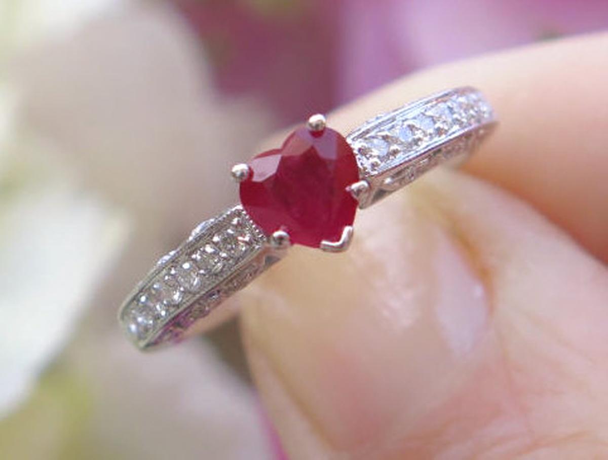 Heart Cut Ruby Engagement Ring with Diamonds in 14k white gold   Natural Heart Cut Ruby Engagement Ring with Diamonds in 14k white gold vintage style setting
