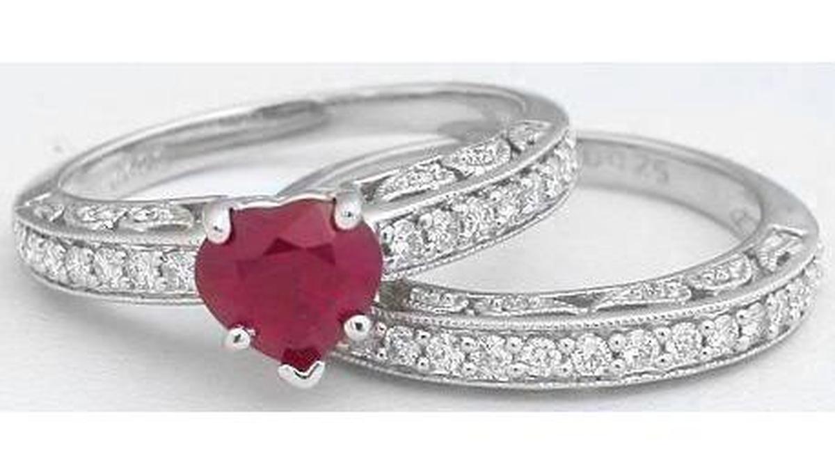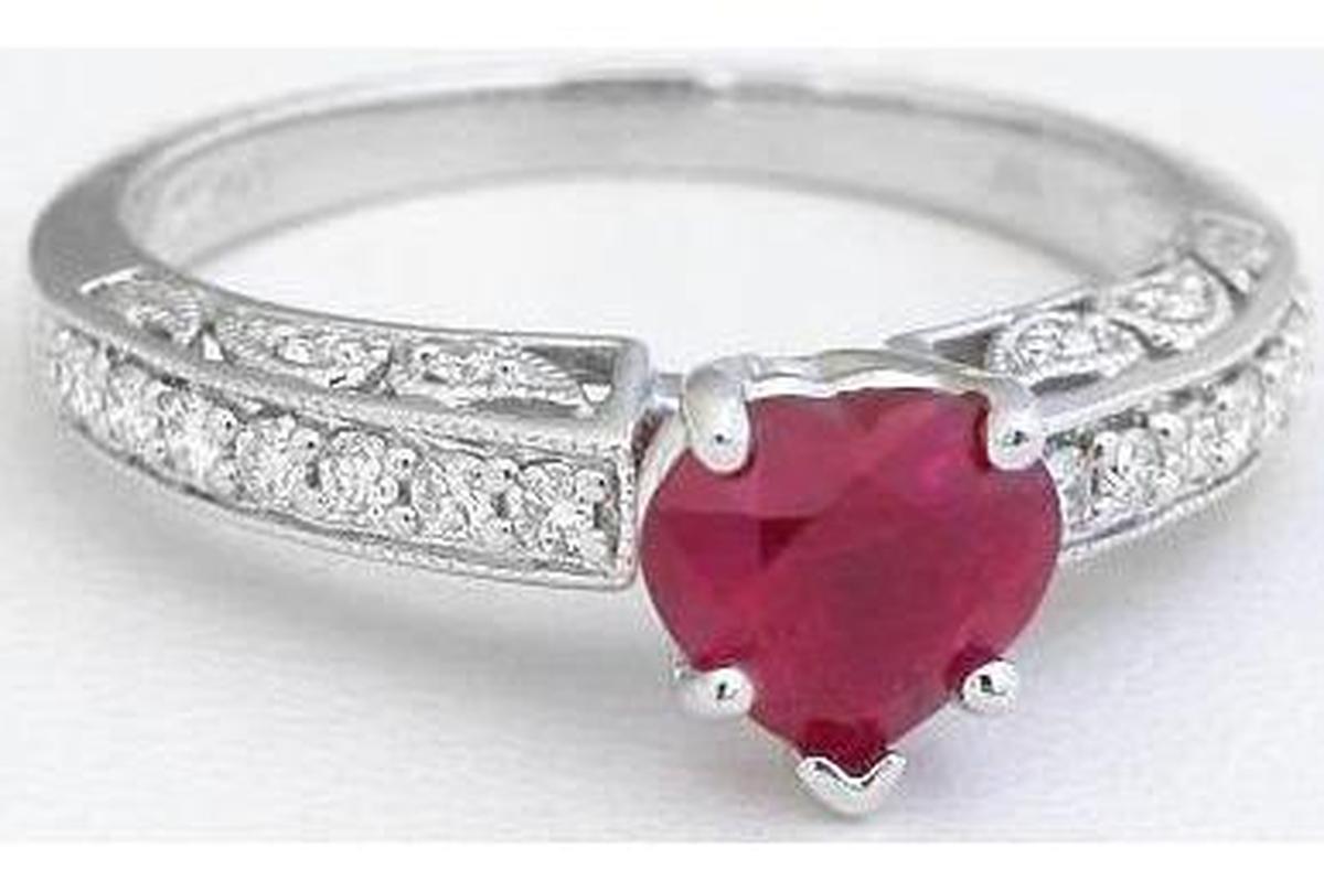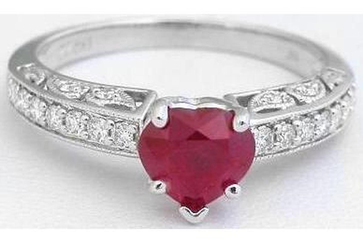 Special Features: This elegant engagement set has an antique feel with the abundant milgrain edging and amazing detail on the sides of the rings.  Twenty-two fine diamonds are pave set across the top and in the paisley pattern on the sides of the engagement ring, and the matching band is similarly set with twenty-five diamonds.  We've chosen a beautiful Burmese ruby, in a heart shape, for the center of this truly special ring. The ruby is a wonderful color, a true red, not purplish or pink, and it is bright and very clean. We think the ruby is a perfect size and the set will complement any finger size.  What a delightful, romantic choice that will be cherished for generations.