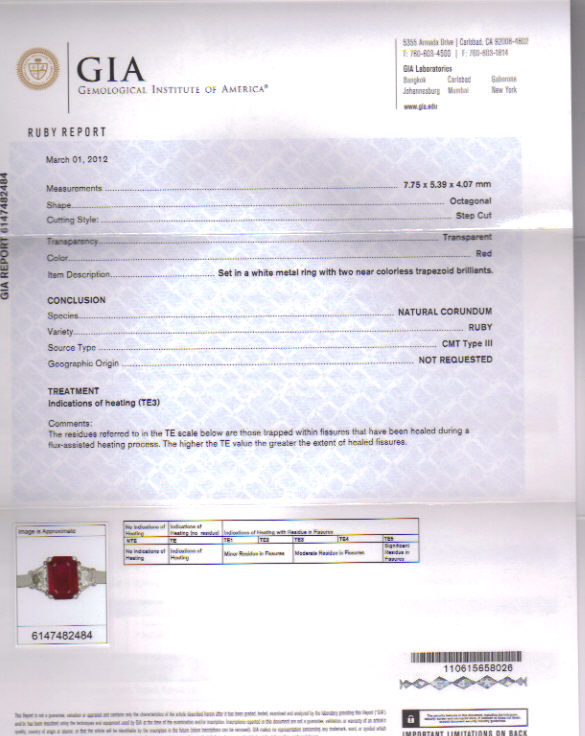 GIA Laboratory Tested: This ruby has been tested by the Gemological Institute of America (GIA) Laboratory. The GIA Ruby Report is shown on the right (click to enlarge) and is included with your purchase.