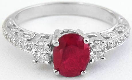 Special Features:This ring is elegant and feminine and the beautiful antique styling harkens back to an era gone by. We've set a very fine quality, luxurious rich red oval ruby at the center of a pair of gorgeous sparkling oval diamonds. The ruby has exceptional clarity, something that speaks to the fine quality of the gem.  The oval diamonds on each side beautifully complement the oval ruby, and tiny full cut round diamonds adorn the intricate detail in the shank.