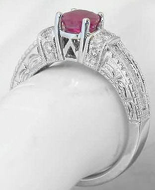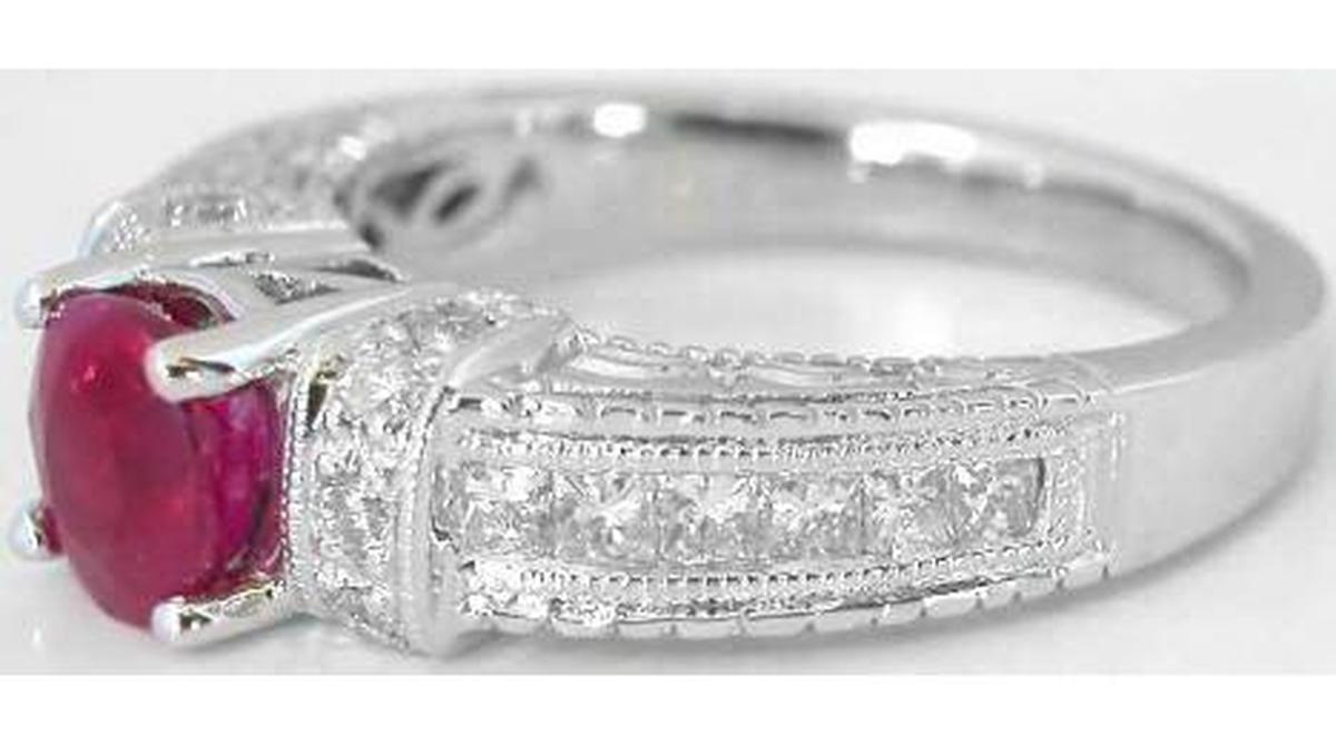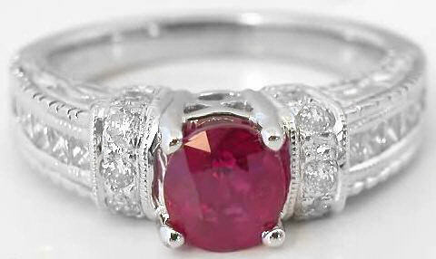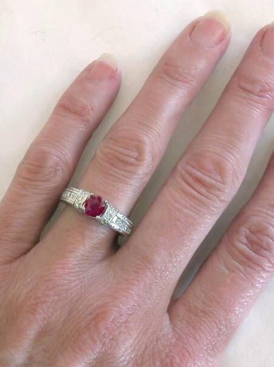 mounting with twelve beautiful princess cut and ten round diamonds. The ruby has an inviting rich (but not