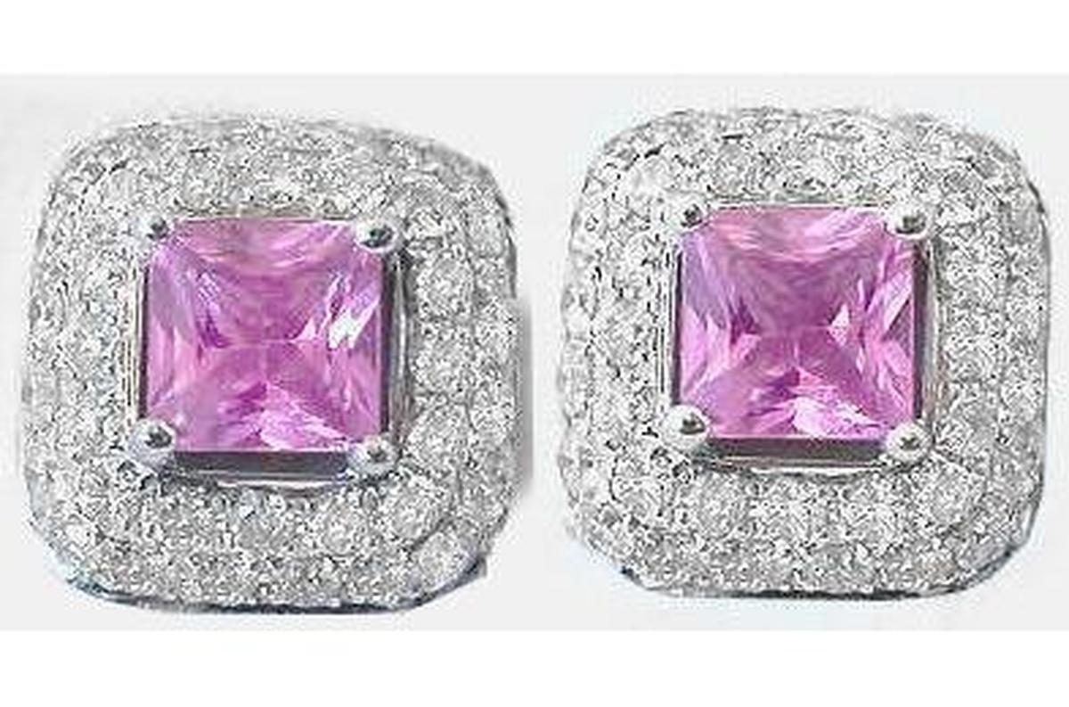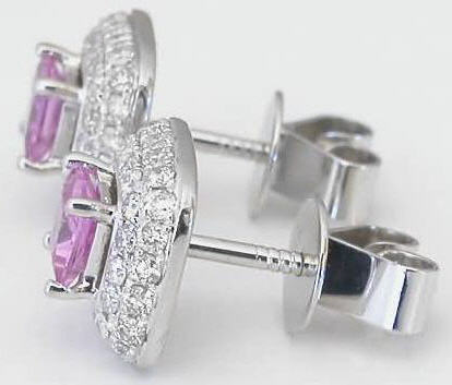 Special Features: These exceptional pink sapphire earrings are truly beautiful with over 1/2 carat of pave diamonds! If you're looking for a dressy stud style earring, these are an ideal choice. We have used 4mm bubble gum princess cut pink sapphires in these earrings and then surrounded them with two rows of diamonds. The diamonds give the earrings a more substantial and special look. The sapphires are carefully matched by hand and the settings have a screwback for added security.