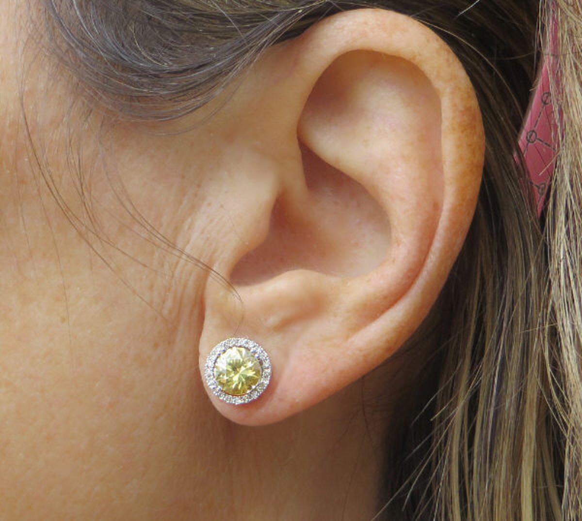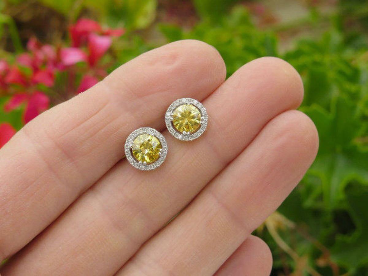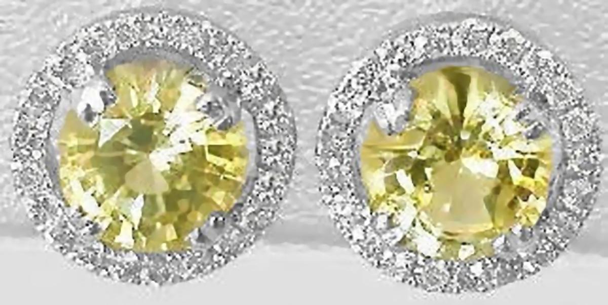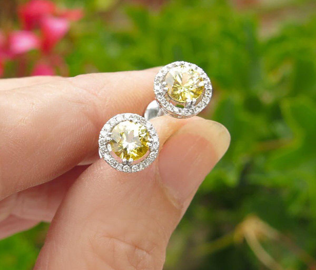 Round Natural Yellow Sapphire and Real Diamond Halo Earrings in 14k white gold for sale   Natural Yellow Sapphire and Diamond Stud Earrings in 14k white gold