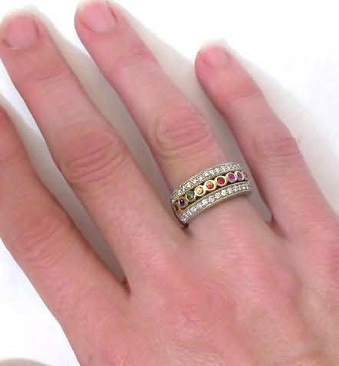 Rainbow Sapphire and Diamond Band Rings in 14k gold   Bezel pave natural ceylon shades of red, orange, yellow, green, blue, purple, and pink sapphire band ring in 14k gold