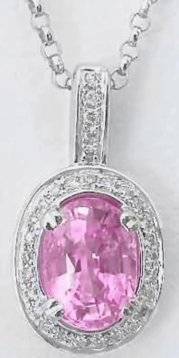 Special Features: This light baby pink sapphire is framed gently with diamond accents in this elegant and stunning pendant. The oval sapphire has a beautiful cut and is eye clean. The color is a feminine baby pink and looks so pretty on every skin tone. The diamonds around the sapphire highlight the sapphire beautifully, and even the bail is finished with diamond accents. The pendant has even has an undergallery on the back which speaks to the quality of the design. A nice 16 inch chain is included.