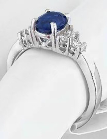 Special Features: This timeless design features a beautiful royal navy blue sapphire accented by three fine white diamonds on either side. The sapphire is clean and fully saturated in color, yet it is not too dark either. The diamonds have absolutely no visible flaws and really sparkle when they catch the light.