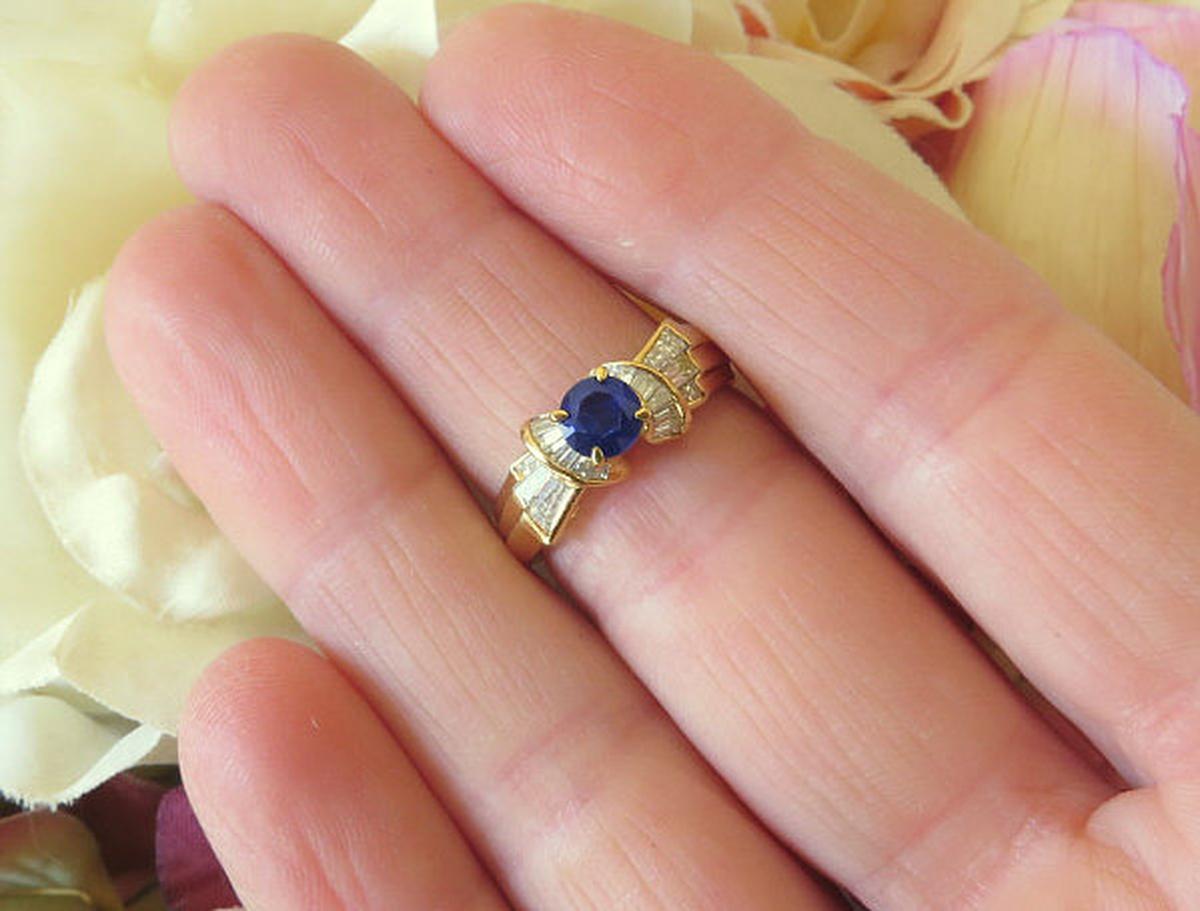 Damiani Natural Round Blue Sapphire Ring with Baguette Diamonds in solid 18k Yellow Gold for sale   Damiani Sapphire and Baguette Diamond Engagement Ring in 18k
