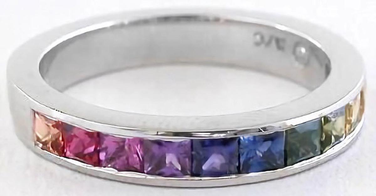 Special Features: Clean and simple, this great channel set band features eleven 2.5mm princess cut sapphires which have been carefully hand selected for a beautiful rainbow color layout. The sapphires are just beautifully saturated in color, eye clean and lively too. This band would make a great daily wear right hand ring or you can add a splash of color to your engagement ring by adding this as a wedding band as well.