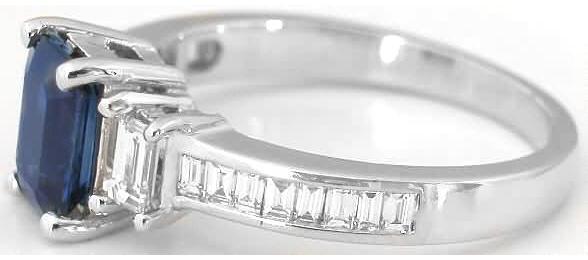 Emerald Cut Natural Blue Sapphire and Baguette Diamond Ring in 14k white gold for sale   Natural Blue Sapphire and Baguette Diamond Ring in 14k white gold