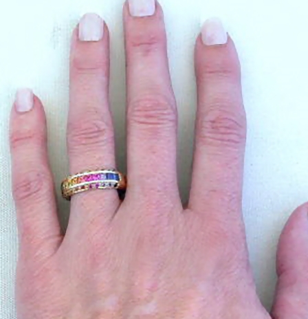 Special Features: You will just fall in the love with the incredible colors of the sapphires we have used in this ring. The shades of green, yellow, orange, red, purple, pink and blue come alive in this beautiful band style ring. The round sapphires above and below the princess cuts match beautifully for a custom look. The band is 7mm wide all the way around.