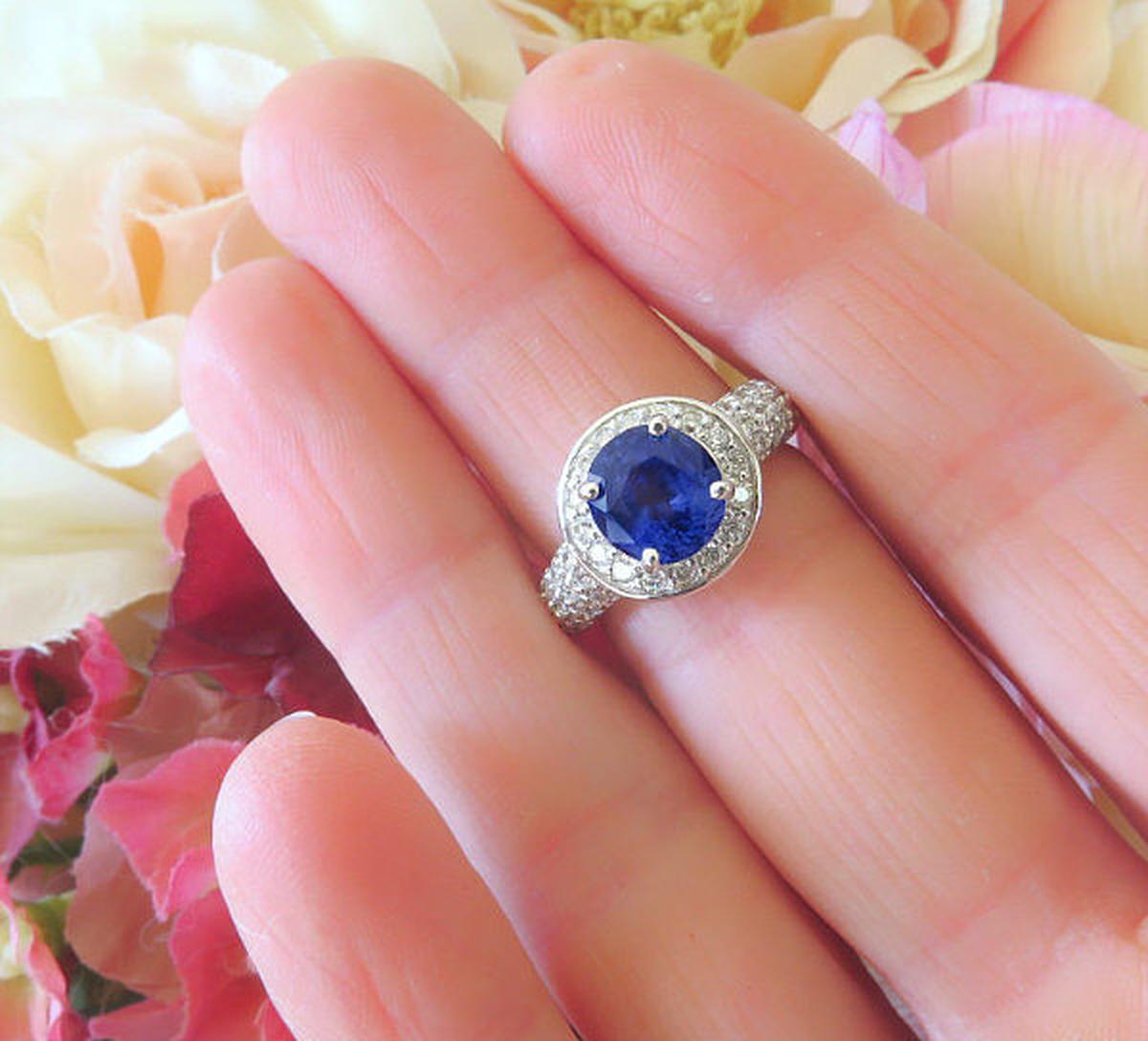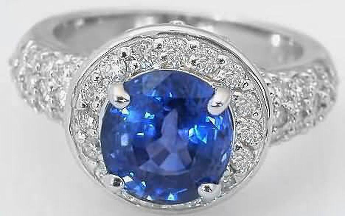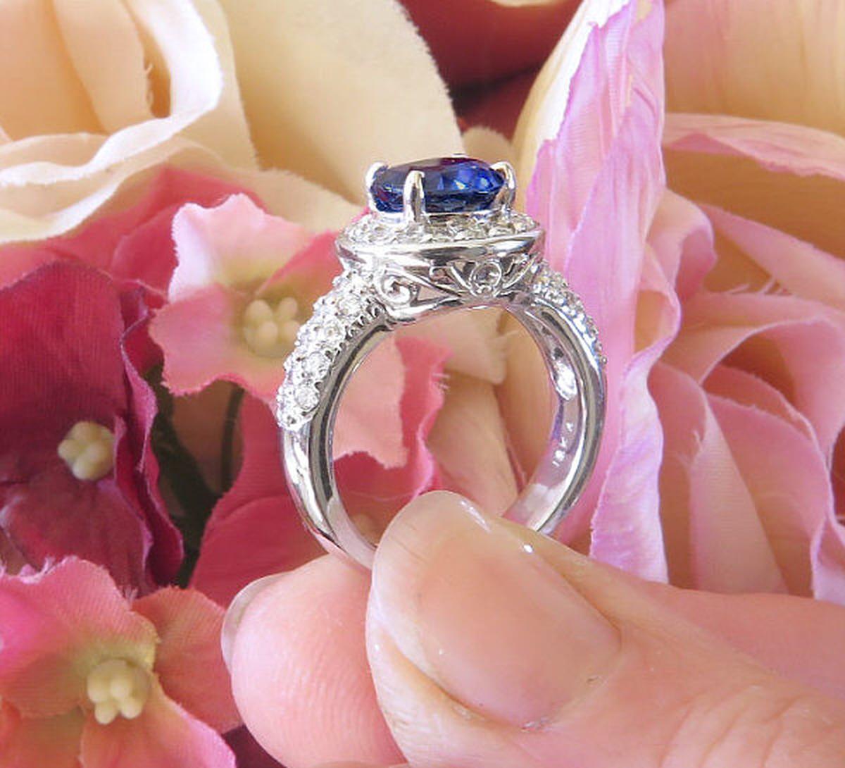 breath away when you open the box. The Ceylon sapphire at the center is nearly 3 carats in size and it has a