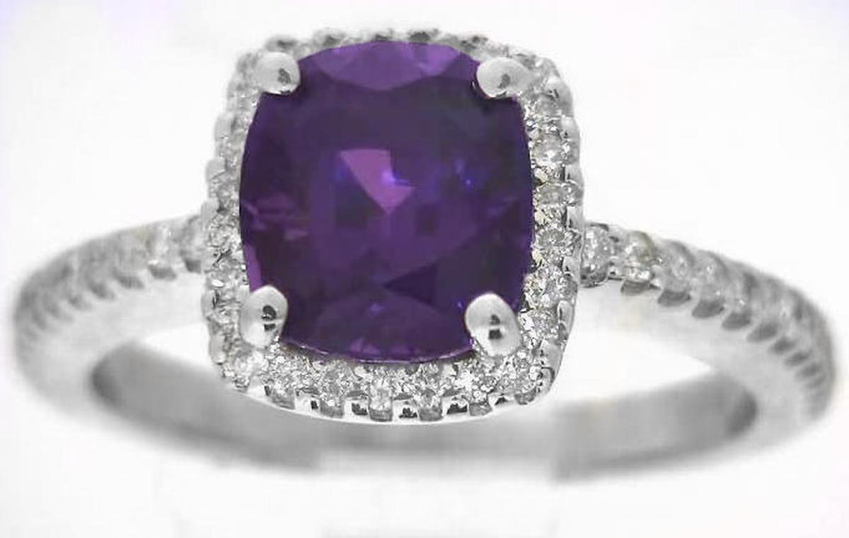 Gemstone: Natural Purple Sapphire Cushion Cut Purple Sapphire Diamond Ring in 14k white gold