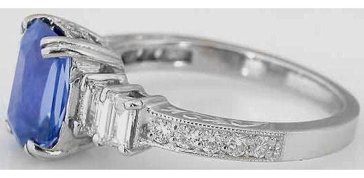 wonderful sapphire in a vintage inspired mounting with baguette and