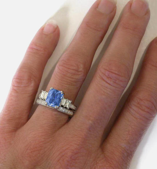 engraved detail on the sides. The matching band is beautifully contoured to sit close to the sapphire ring. The